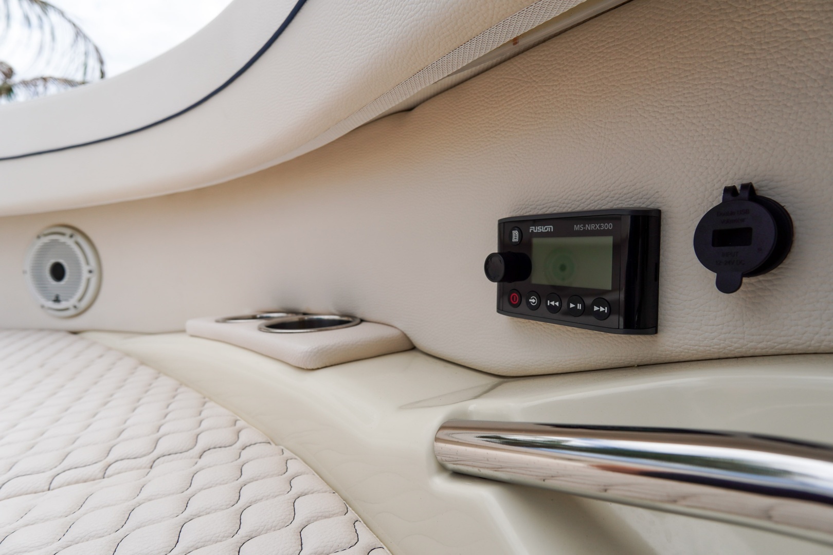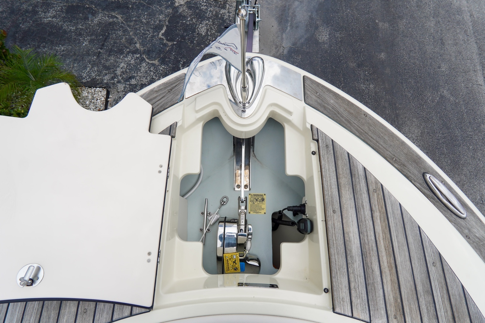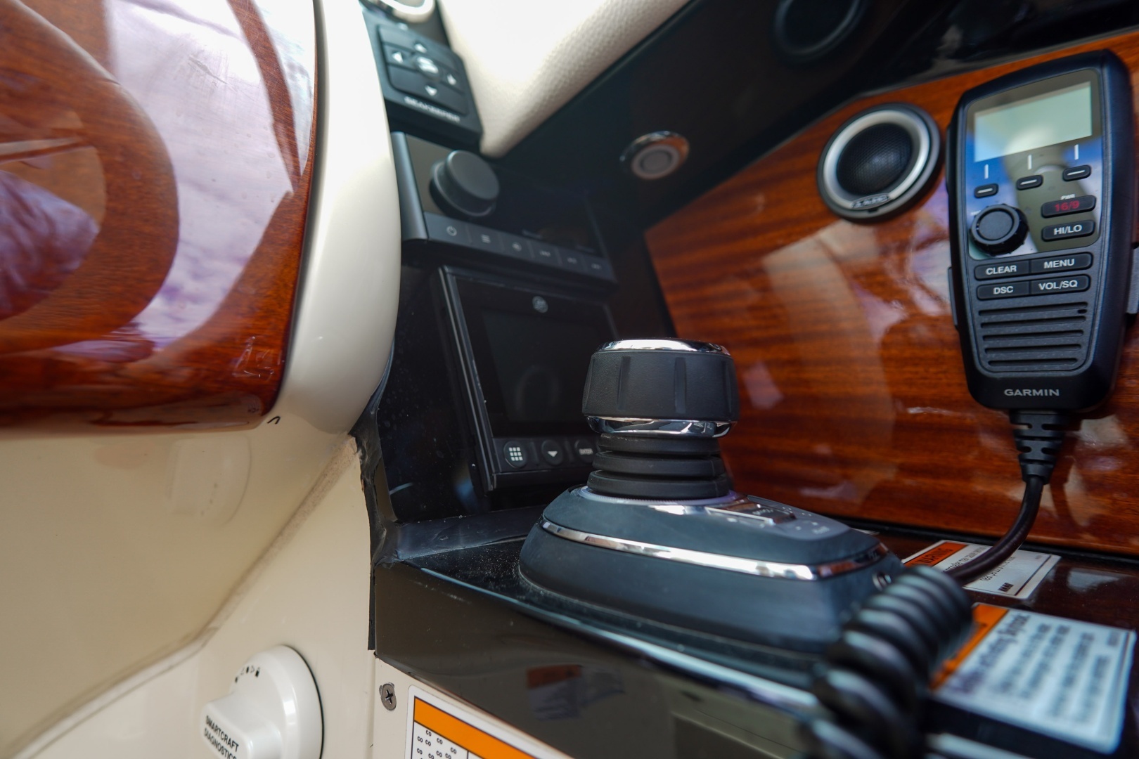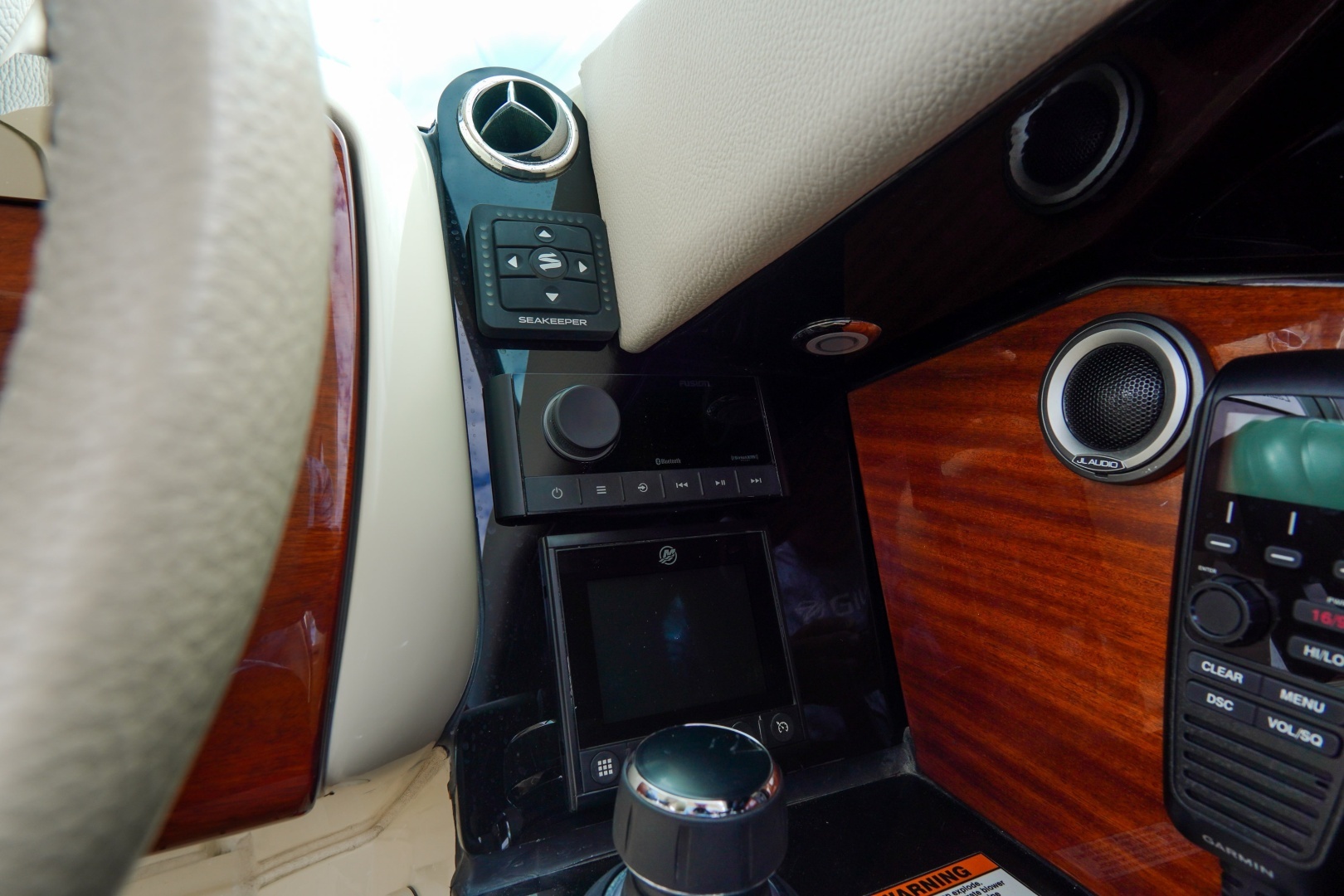 Equipped with modern technology, the helm features a 12” multifunction display, Garmin VHF, and a premium upgraded sound system. Additional features such as air conditioning, underwater lighting, bow docking lights, windlass anchor system, and Seakeeper Ride ensure a smooth and comfortable experience in all conditions.