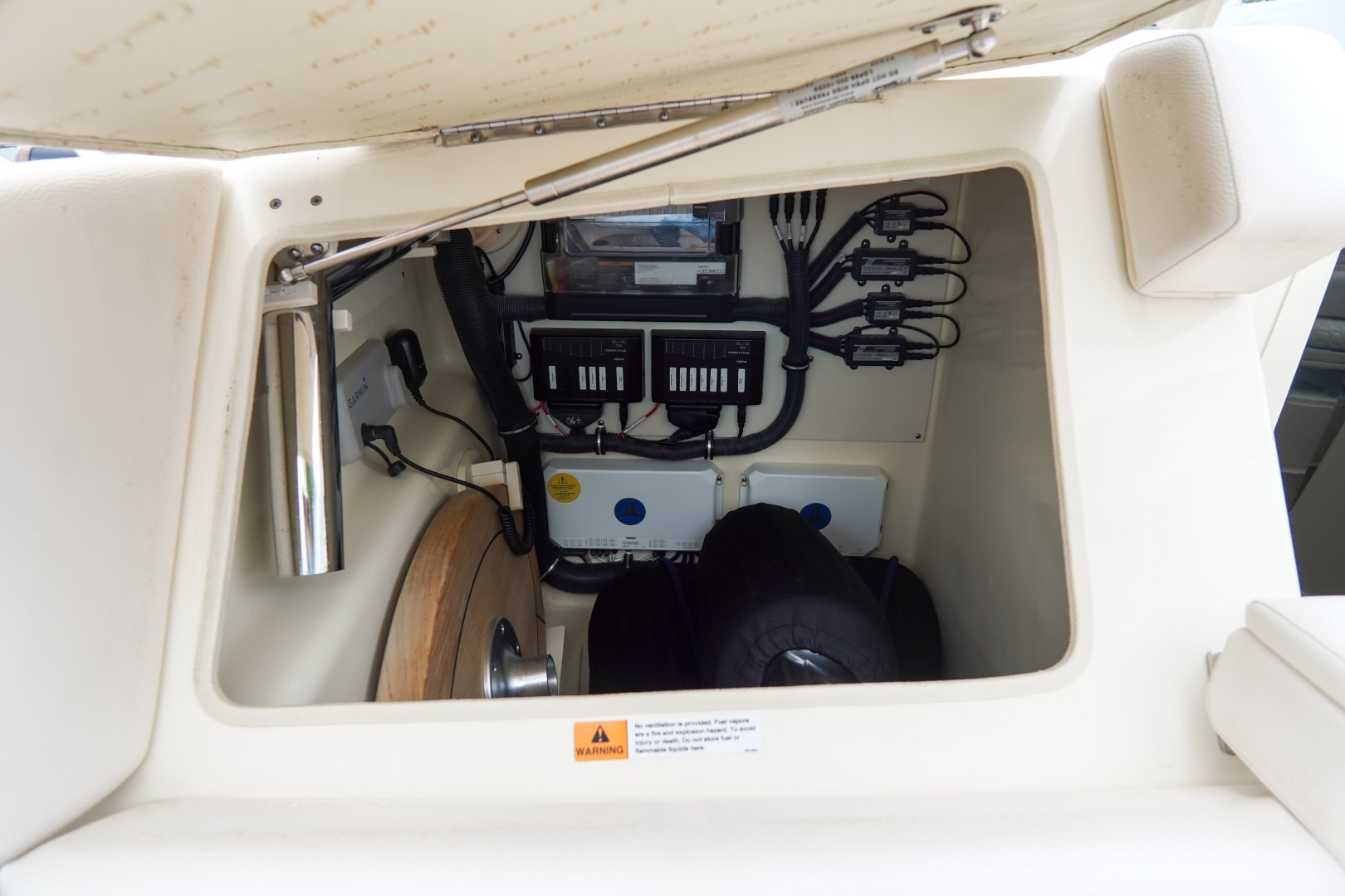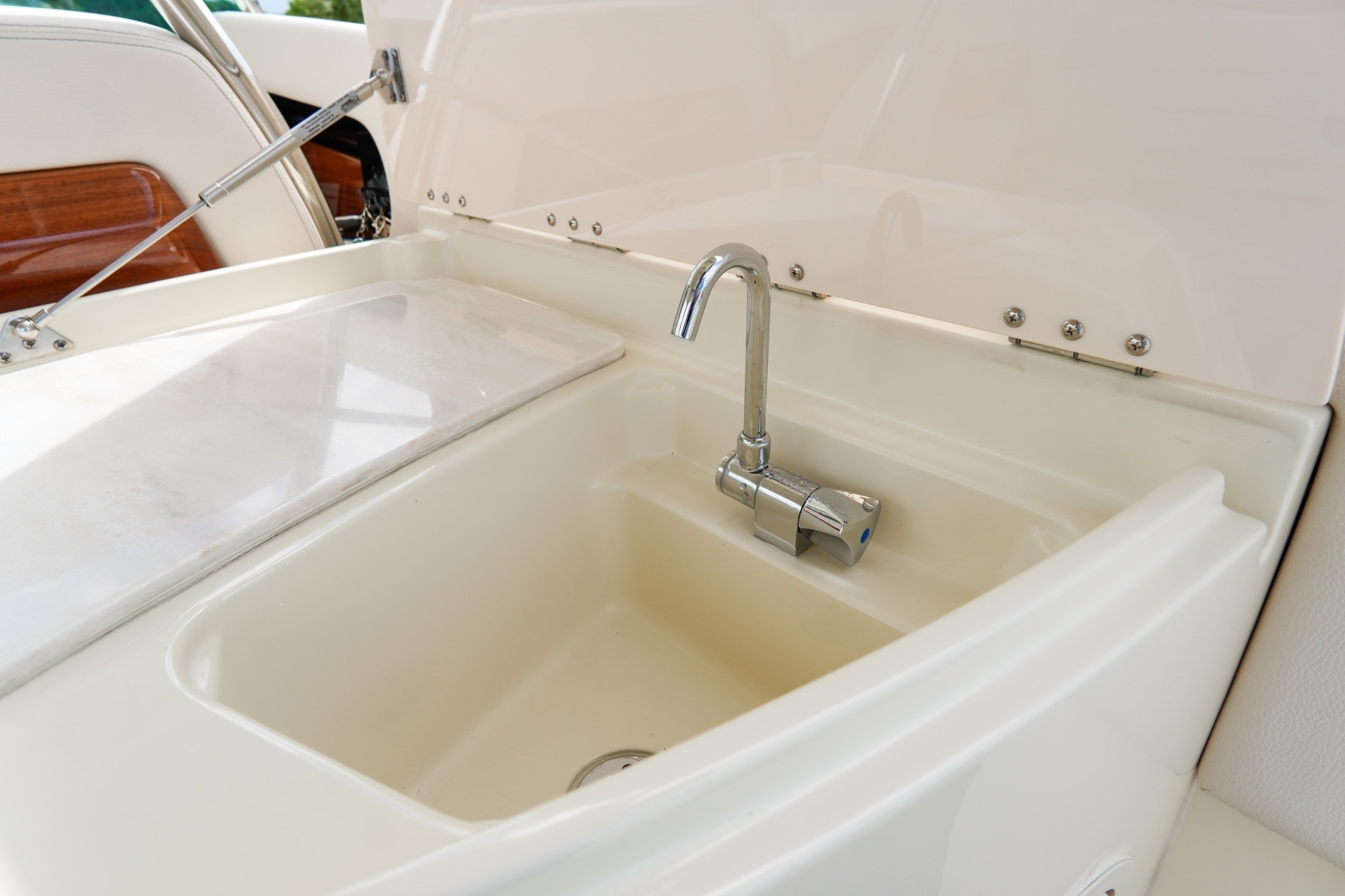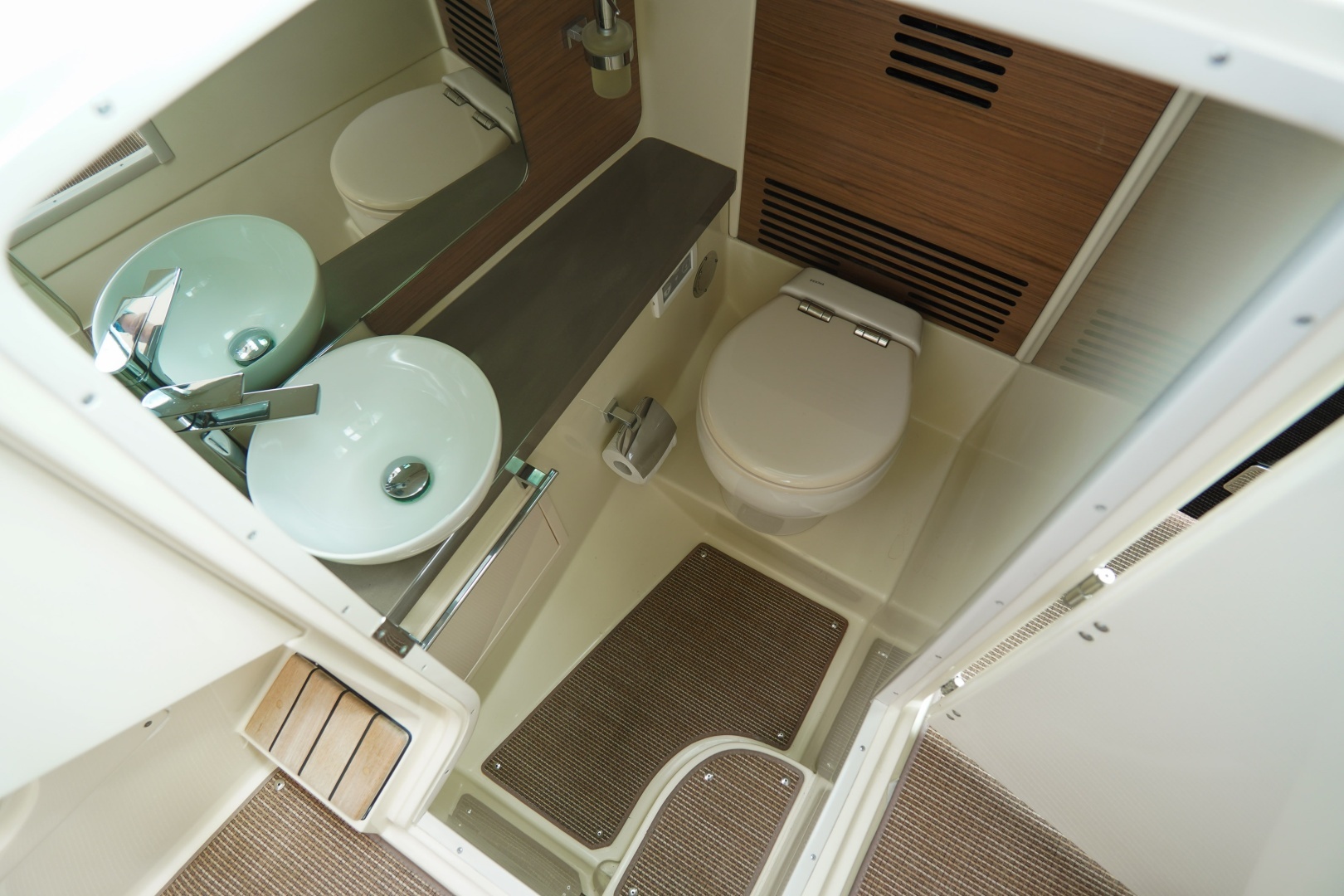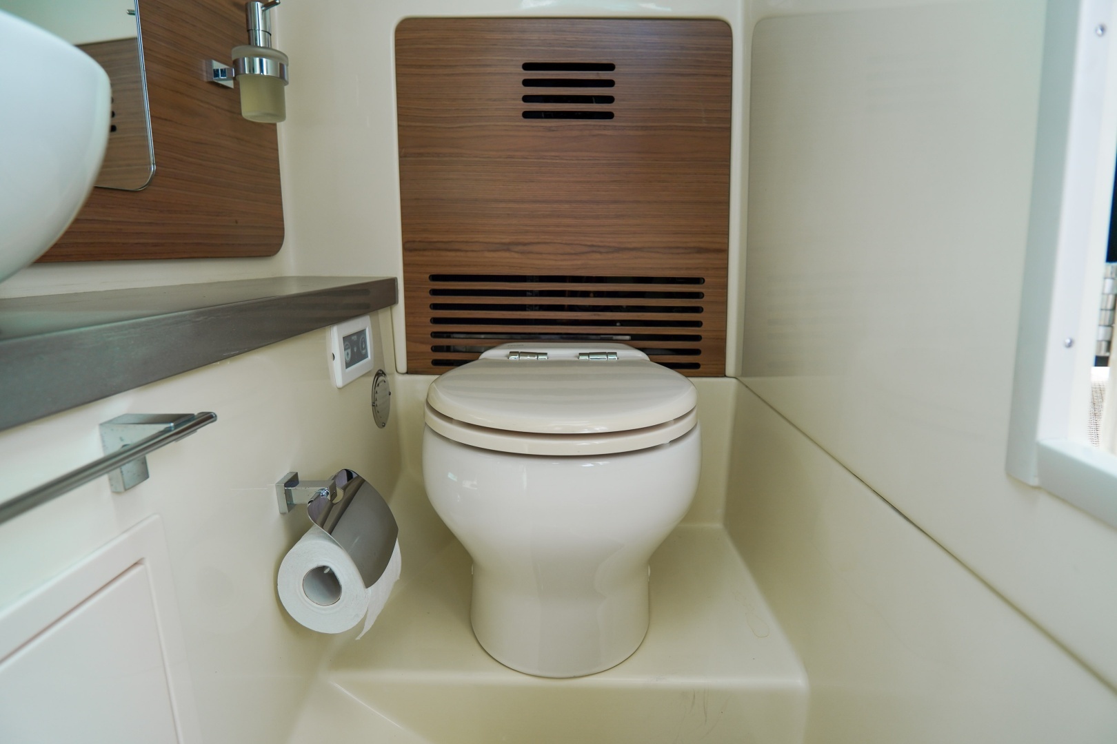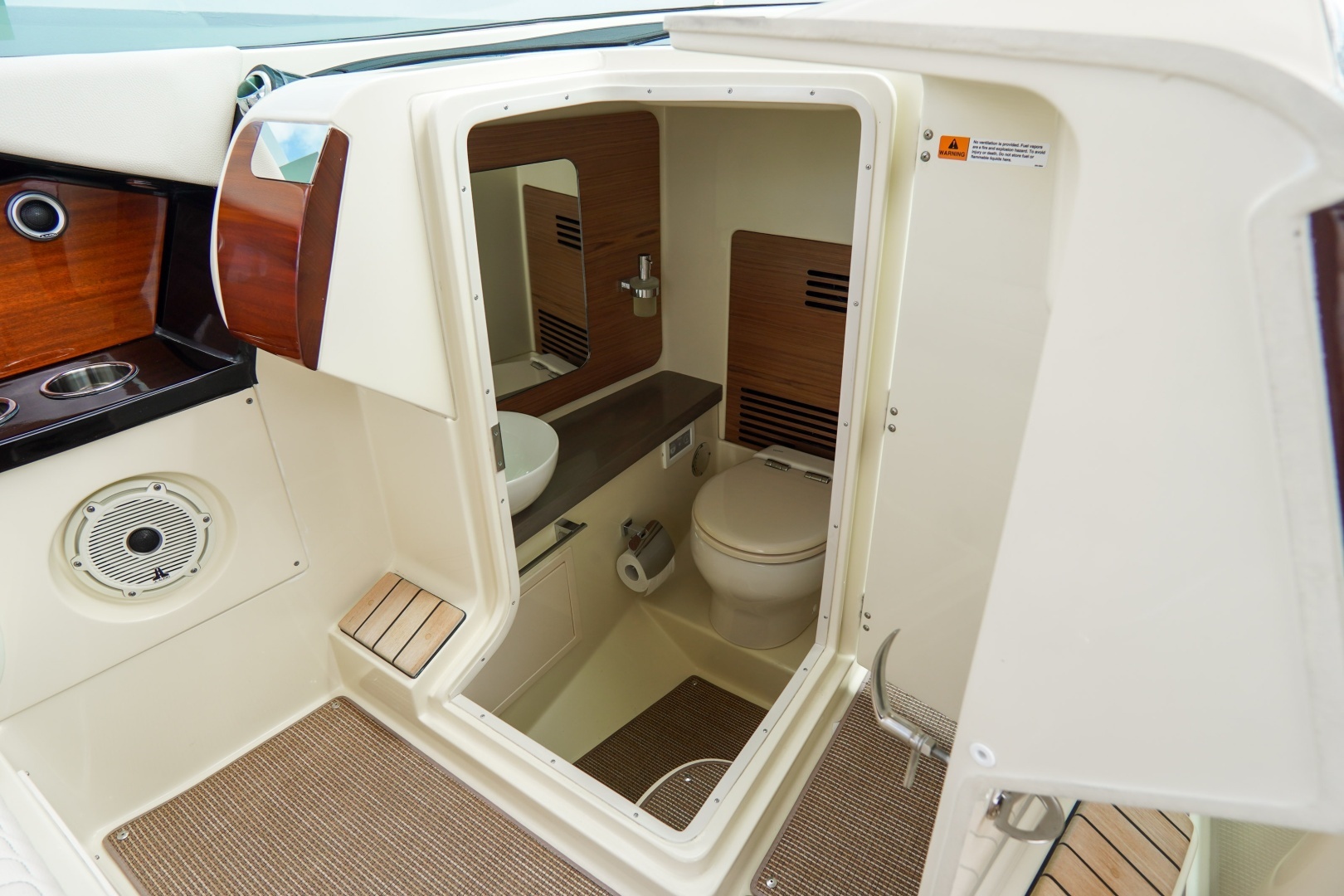Equipped with modern technology, the helm features a 12” multifunction display, Garmin VHF, and a premium upgraded sound system. Additional features such as air conditioning, underwater lighting, bow docking lights, windlass anchor system, and Seakeeper Ride ensure a smooth and comfortable experience in all conditions.
