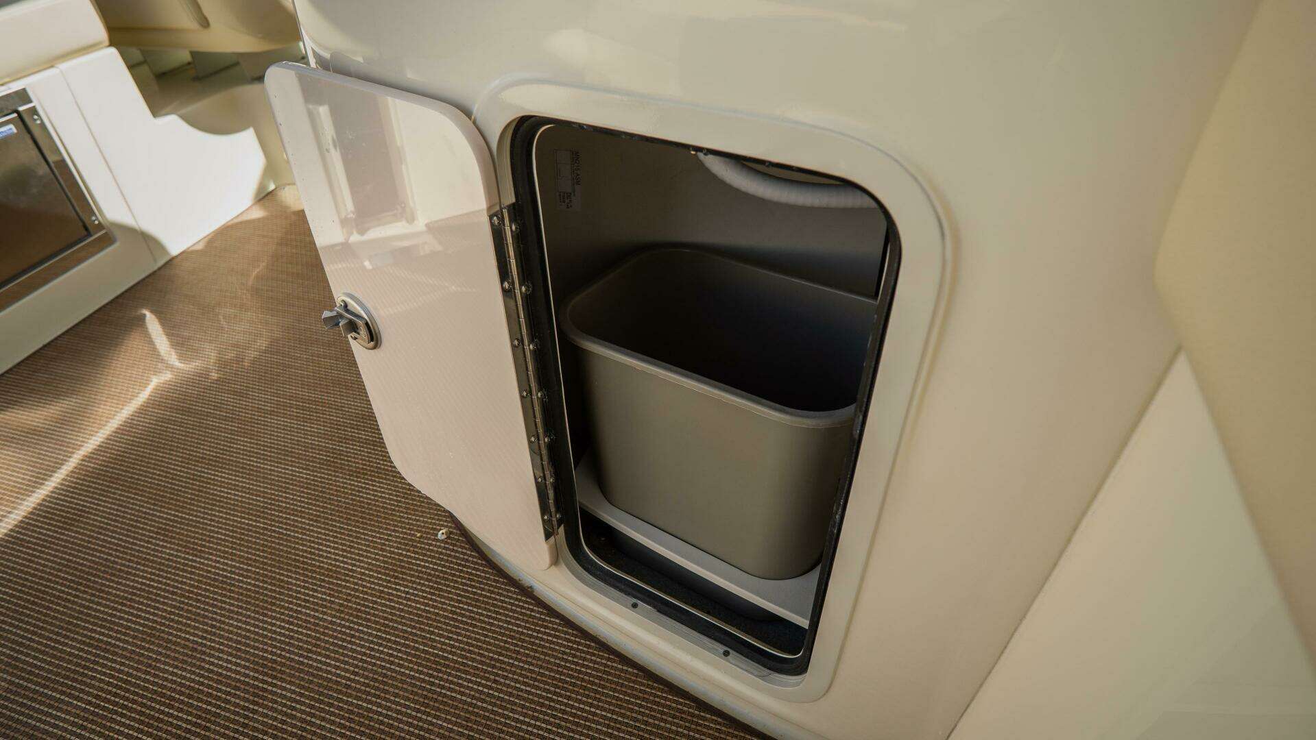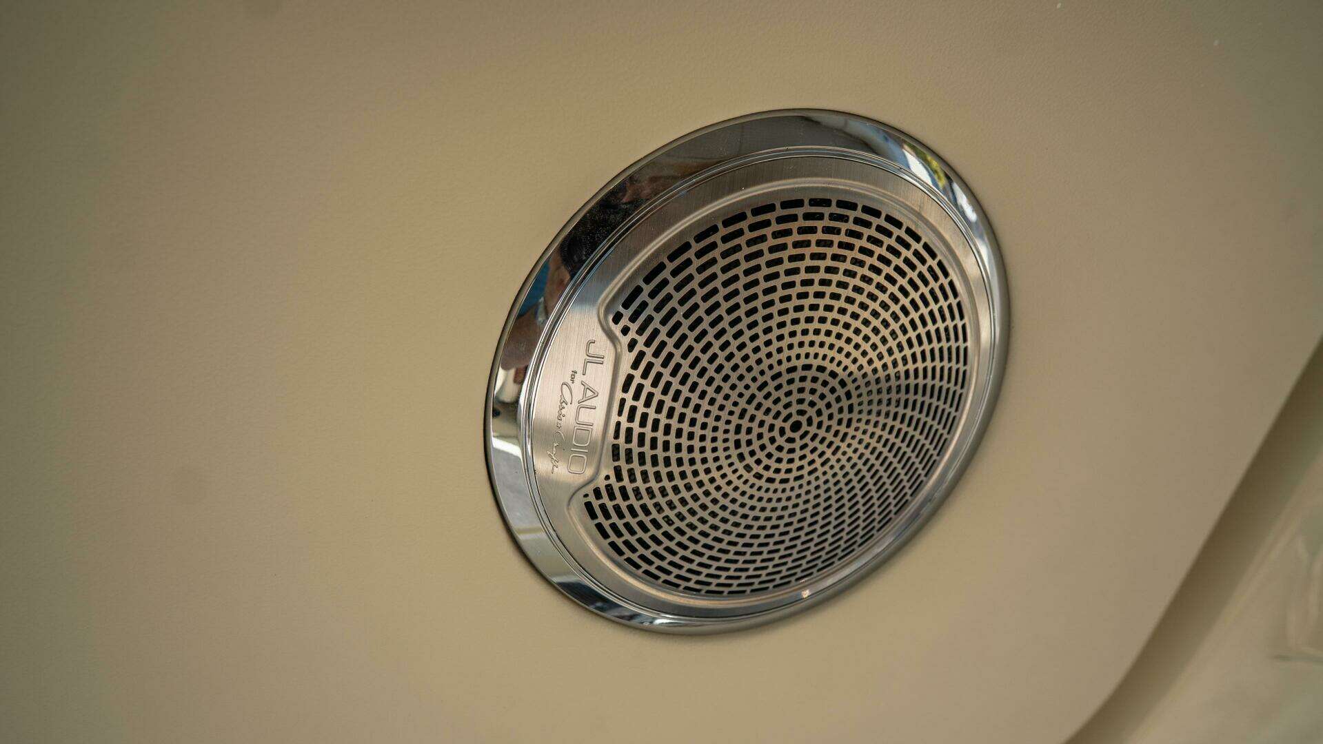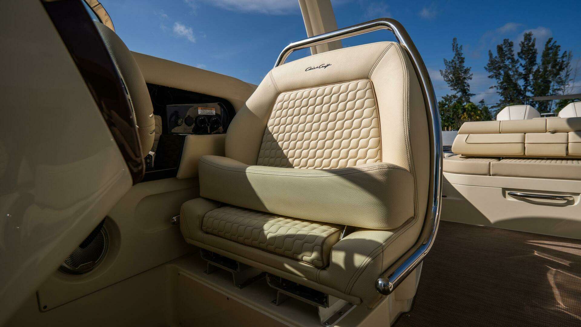 Inside, rich Almond and Toffee upholstery with Navy Blue stitching complements white-washed oak accents and woven seagrass flooring. The cockpit galley includes a sink, refrigerator, and storage, while 12V air conditioning keeps the helm cool. Entertainment is powered by an upgraded audio system with subwoofer, transom speakers, and SP amplifiers.