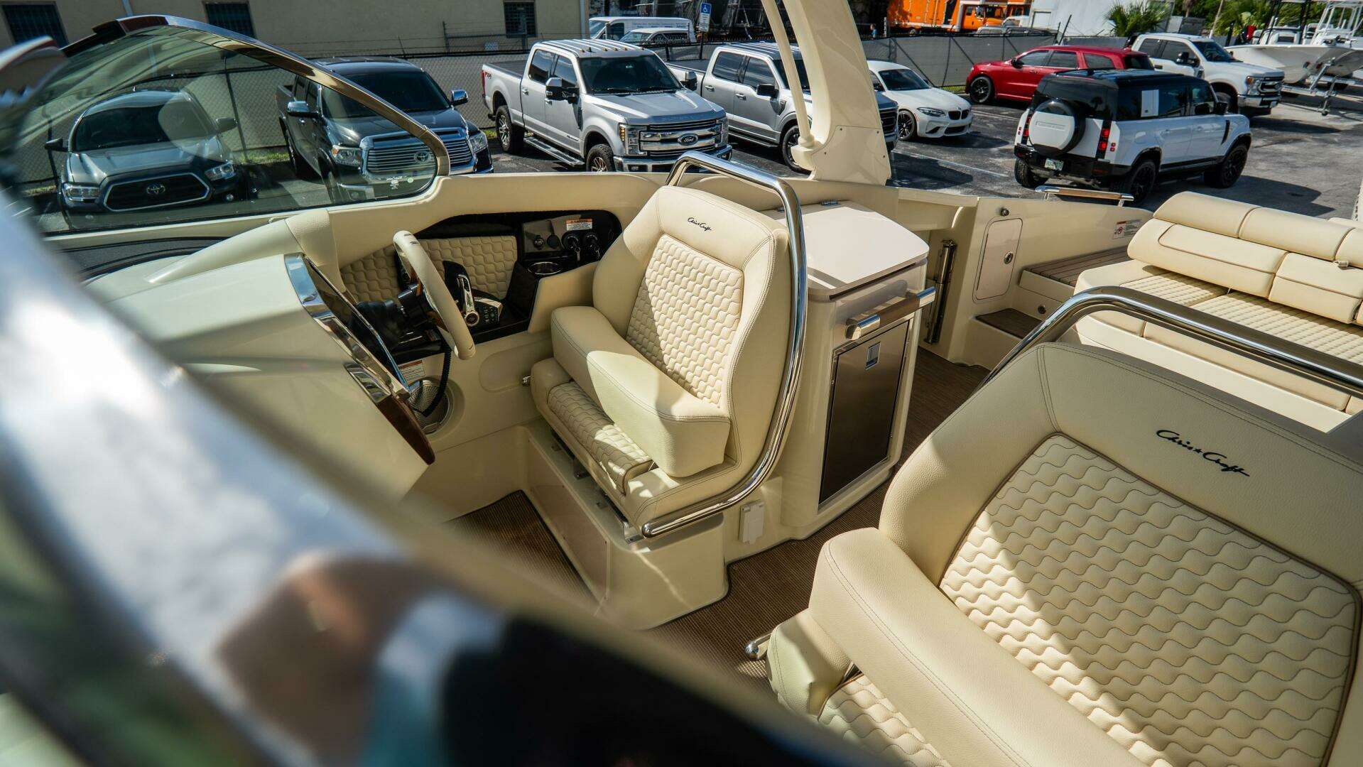 Featuring a Portofino Blue Metallic painted hull, Riviera Red stripe, and Ivory Cream gelcoat base, this boat makes a statement on the water. The custom-painted GT Hardtop with motorized sunshade, premium stainless hardware, and LED lighting complete the striking exterior.