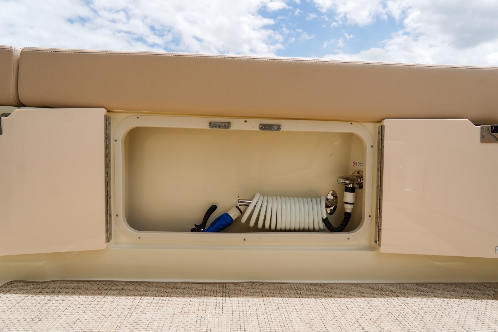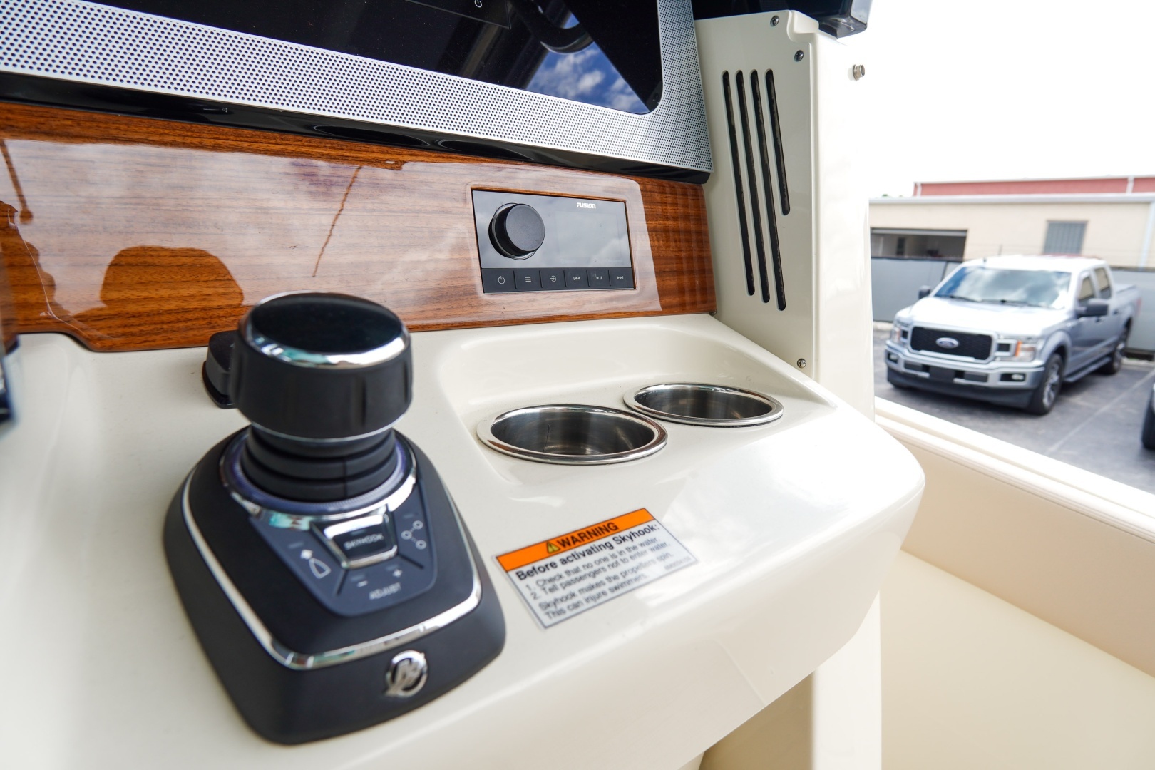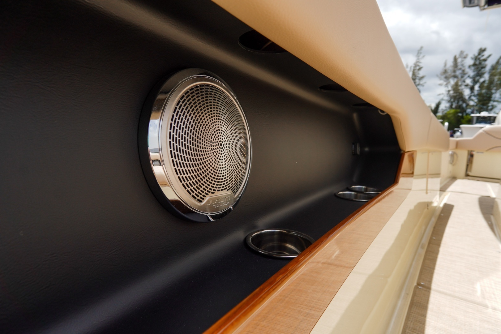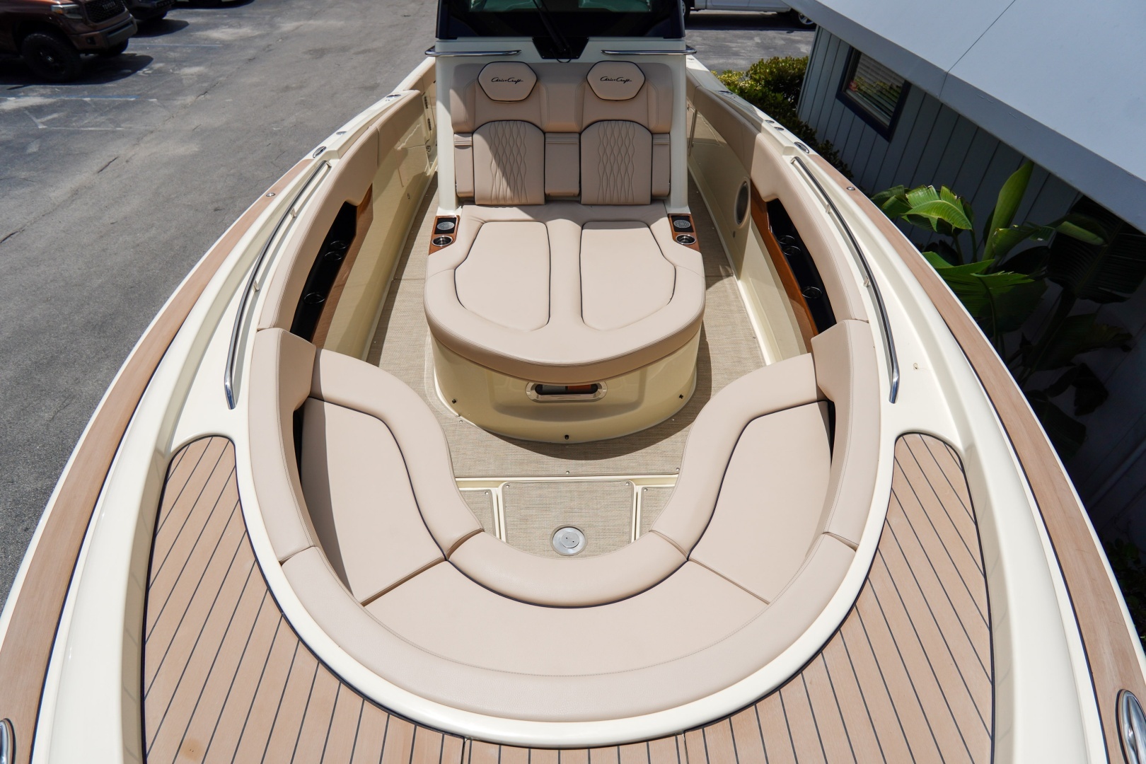 Comfort is a priority with a full air conditioning and heating system, helm vents, teak table with bow and stern mounts, and a premium upgraded sound system with additional speakers and subwoofer. The lithium-ion battery system ensures efficient, reliable power, complemented by a water-ready setup.