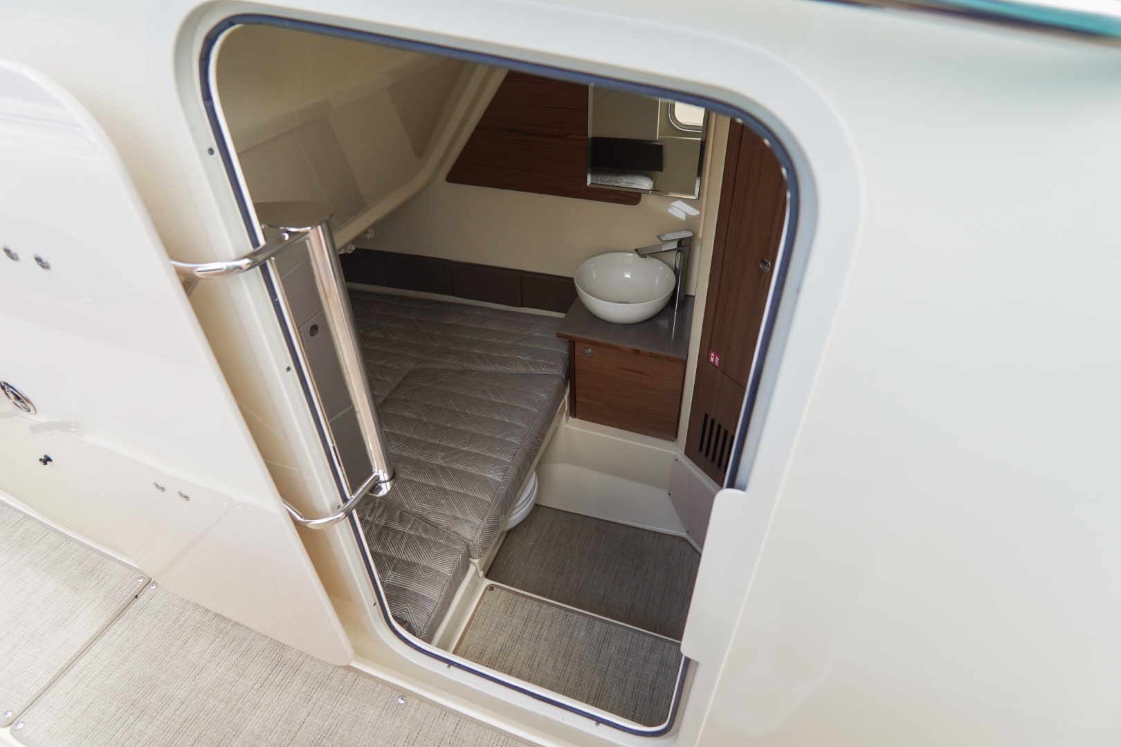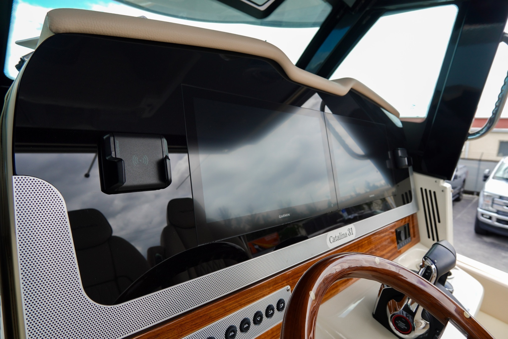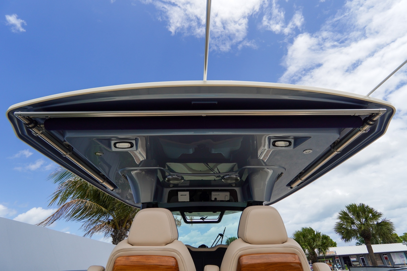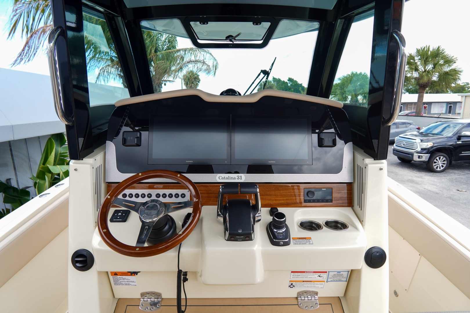 Designed for both serious boating and refined comfort, this vessel features a beautifully appointed interior with walnut wood accents, upgraded Fresco linen upholstery, and woven seagrass flooring. The elevated helm deck platform enhances visibility, while dual 16” Garmin 1643xsv multifunction displays provide advanced navigation, engine data, sonar, VHF, and stereo integration.