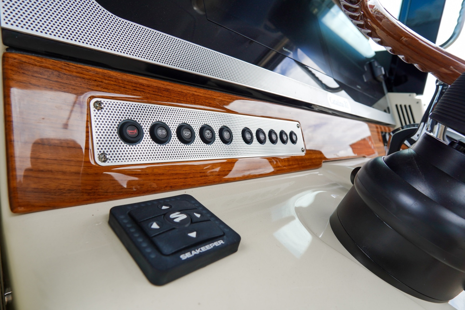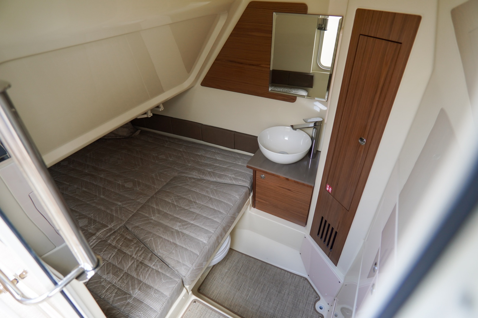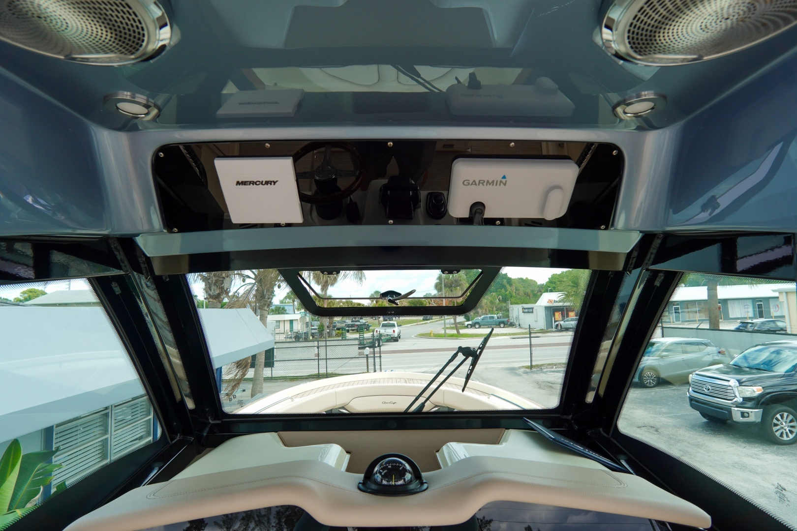 Designed for both serious boating and refined comfort, this vessel features a beautifully appointed interior with walnut wood accents, upgraded Fresco linen upholstery, and woven seagrass flooring. The elevated helm deck platform enhances visibility, while dual 16” Garmin 1643xsv multifunction displays provide advanced navigation, engine data, sonar, VHF, and stereo integration.