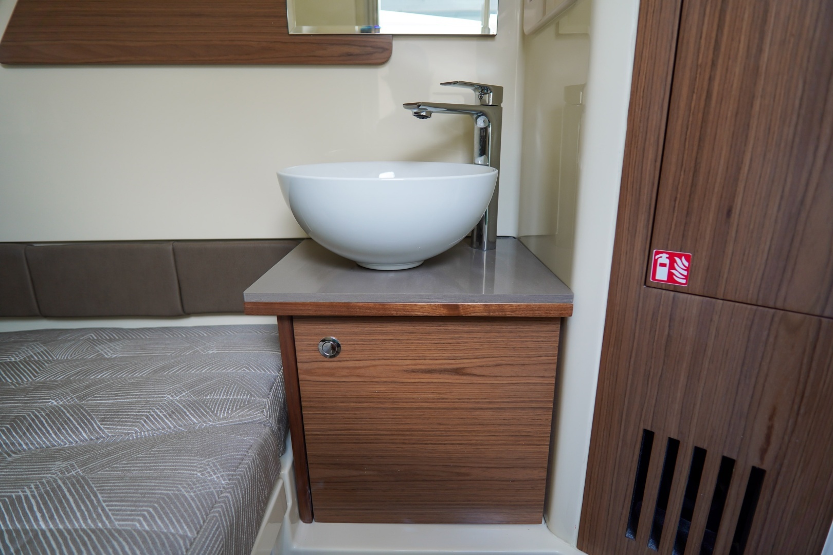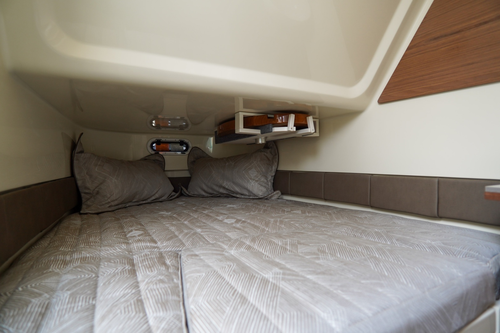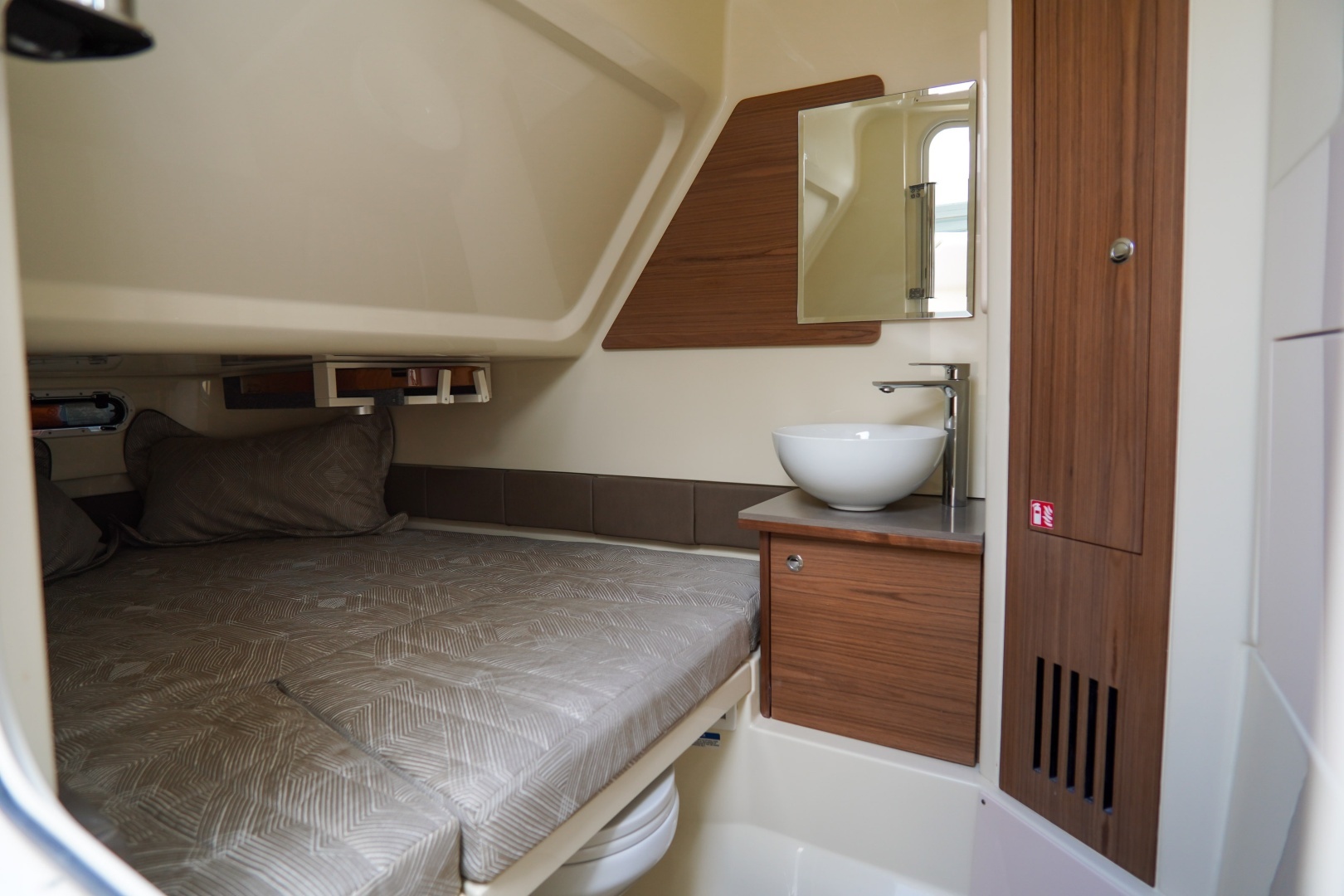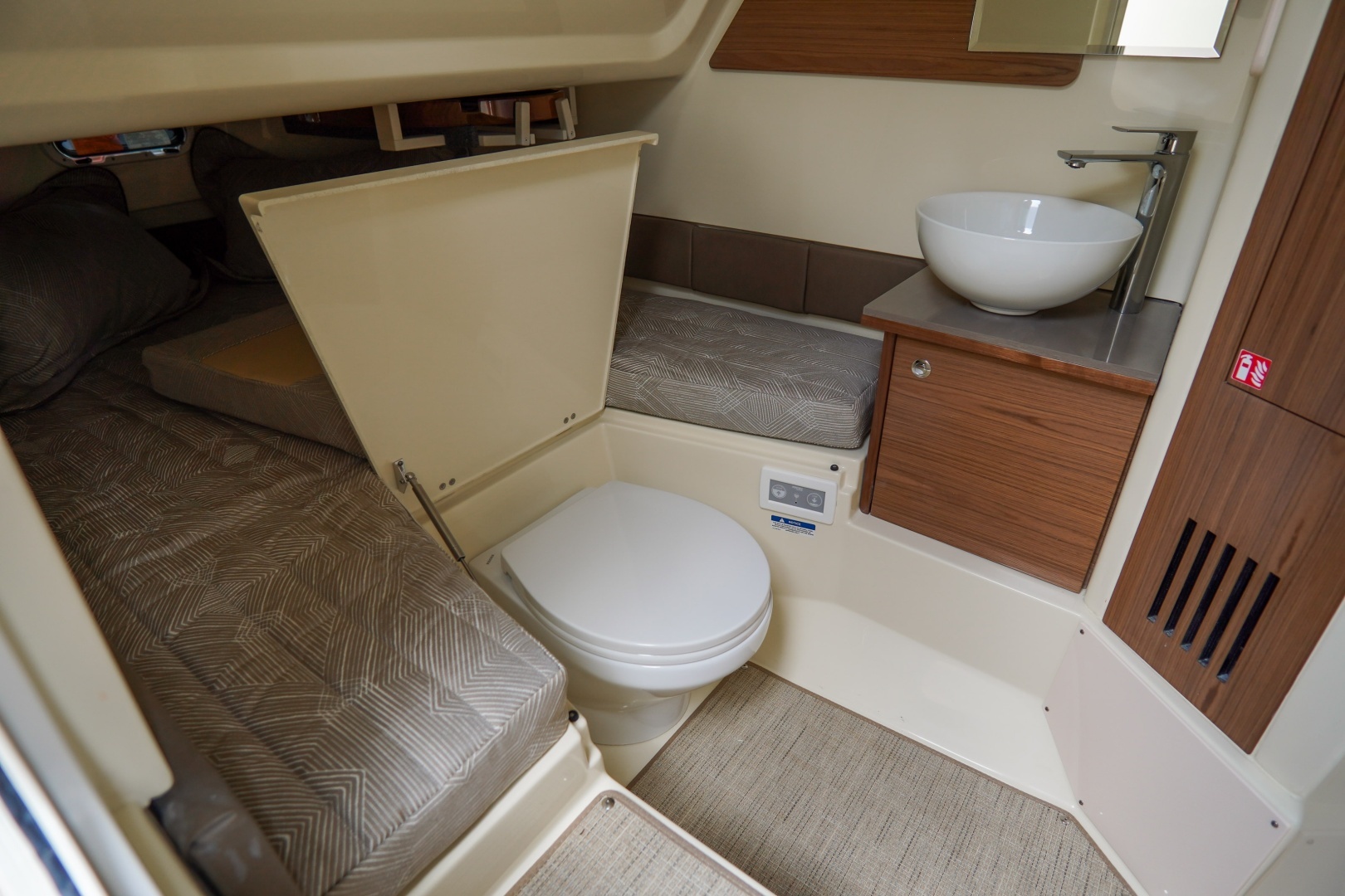 Designed for both serious boating and refined comfort, this vessel features a beautifully appointed interior with walnut wood accents, upgraded Fresco linen upholstery, and woven seagrass flooring. The elevated helm deck platform enhances visibility, while dual 16” Garmin 1643xsv multifunction displays provide advanced navigation, engine data, sonar, VHF, and stereo integration.