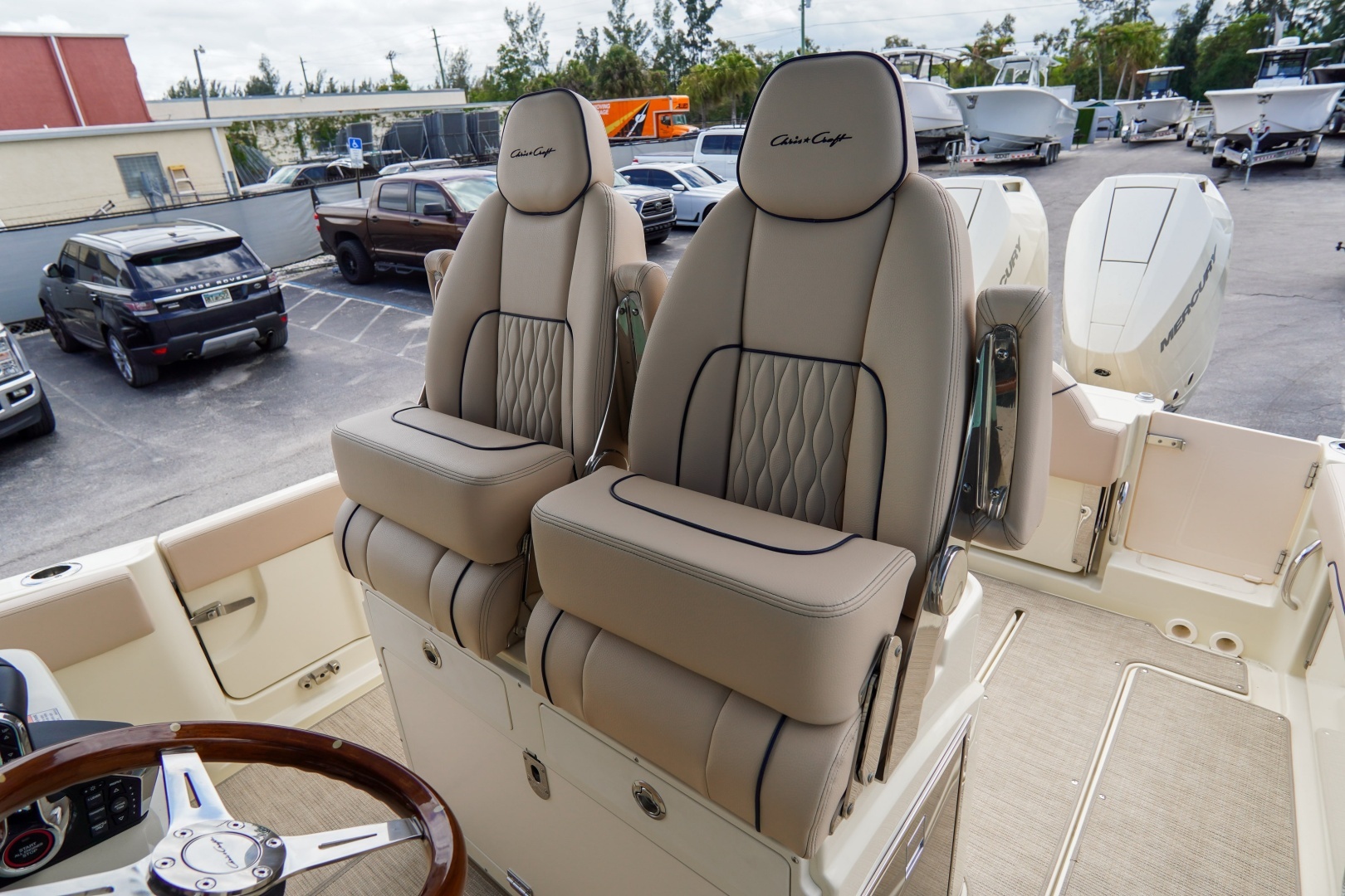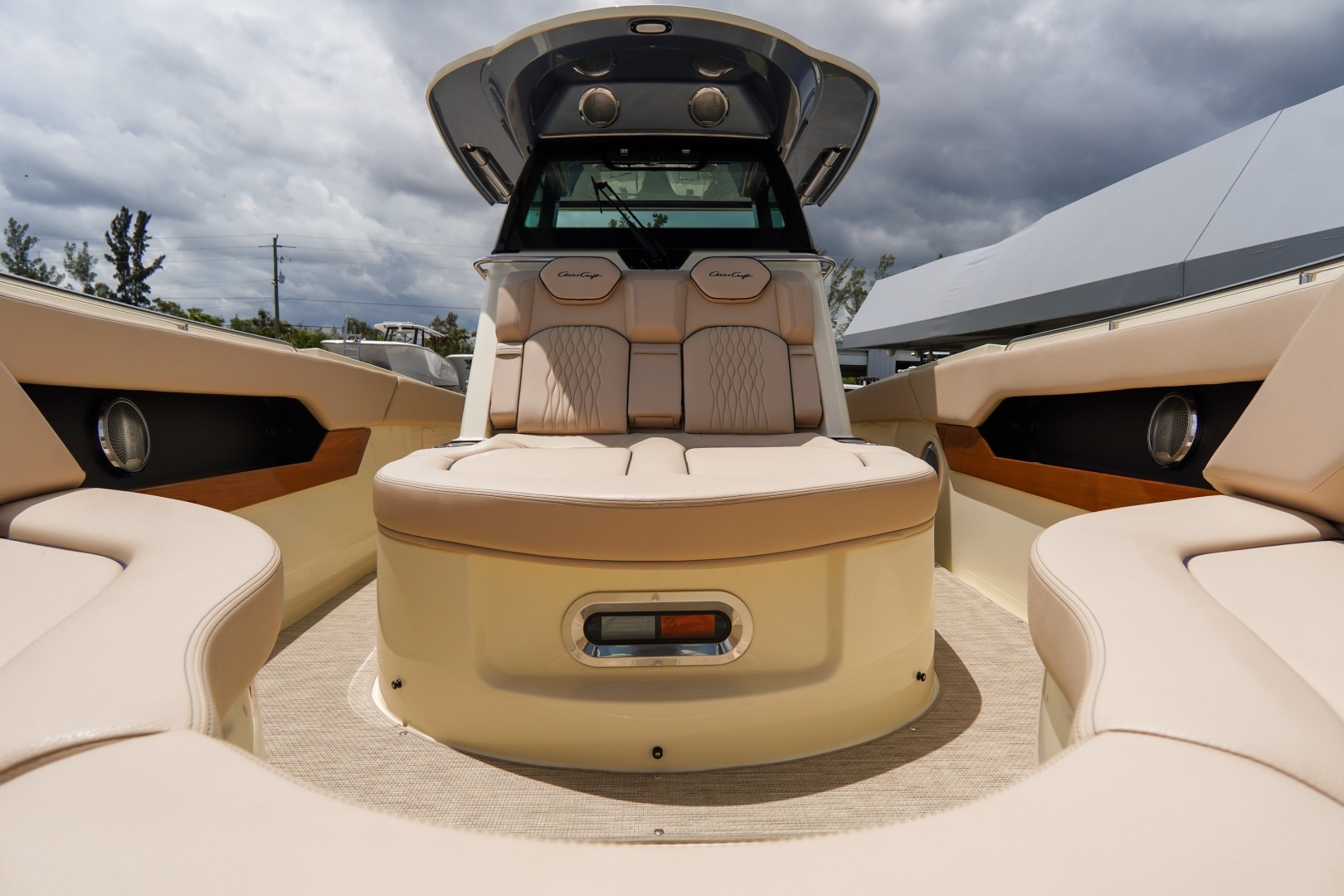Powered by twin Mercury V10 350s with joystick control, this luxury center console features dual 16” Garmin displays, AC/heat, lithium power system, premium audio, teak table, and upgraded finishes. Built for performance, comfort, and style with boat show savings included.
