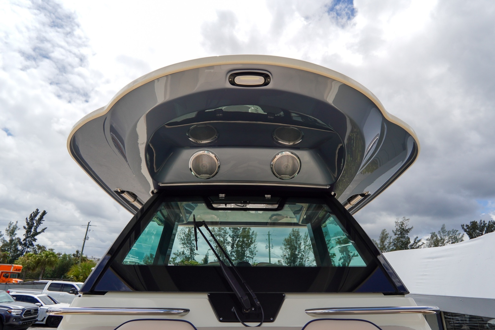Additional highlights include underwater multi-color lighting, a Razor lightbar, windlass anchor system, bow docking lights, painted pilothouse underside, mooring cover, and Sirius weather radio.