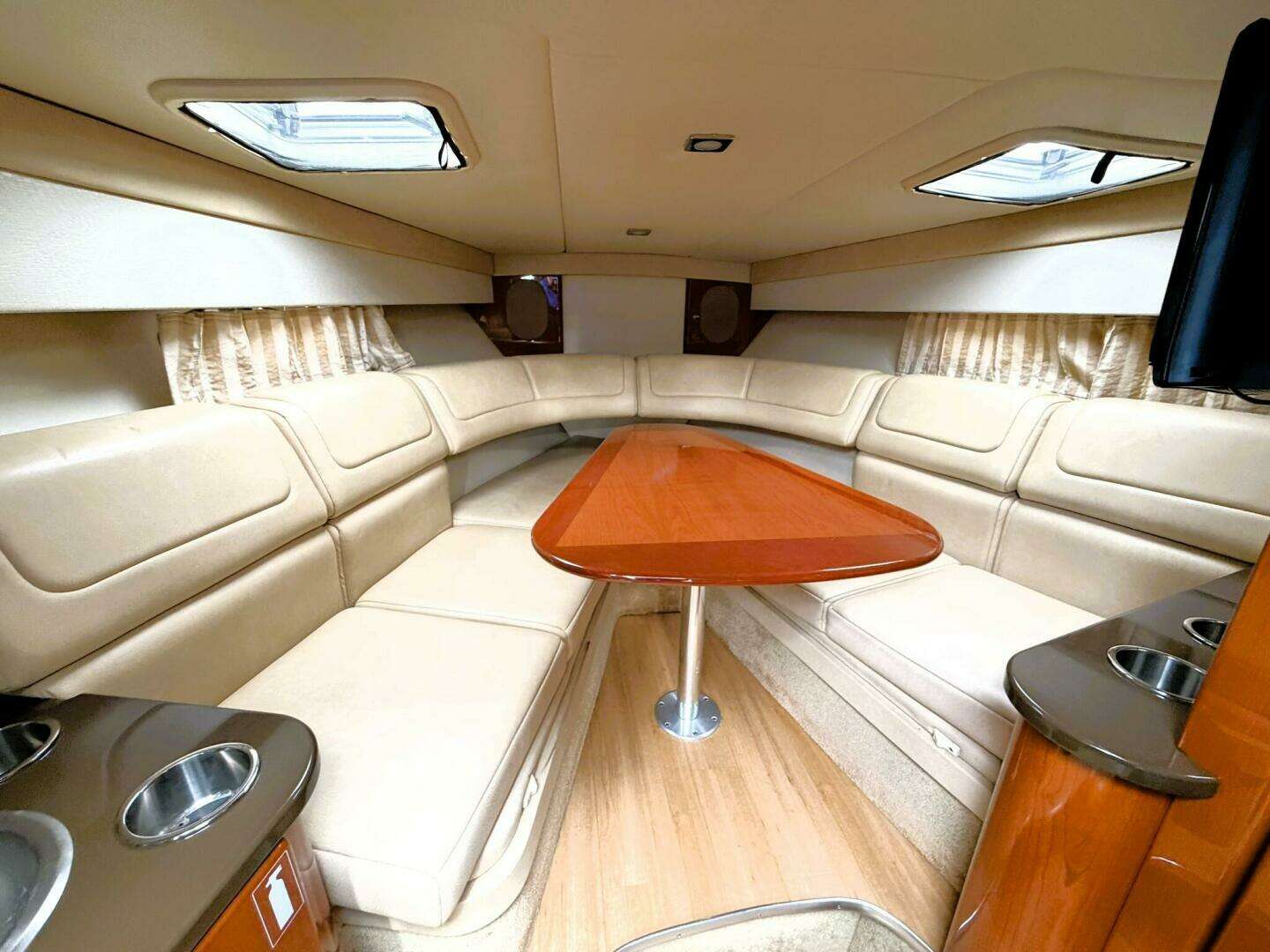 The cockpit is designed for entertaining, featuring lounge seating, wet bar and swim platform with ladder—creating a natural indoor-outdoor flow. Below deck, the cabin offers a convertible dinette, galley, and enclosed head—making overnight stays comfortable for two or more and turning a day boat into a capable cruiser.
