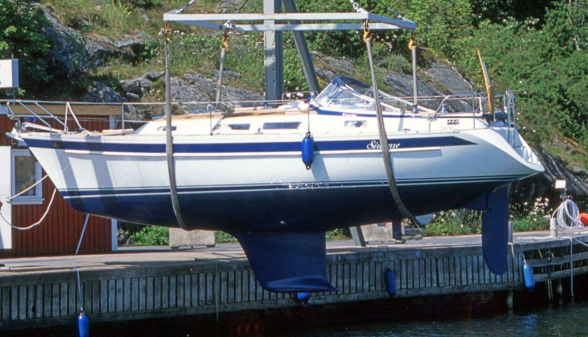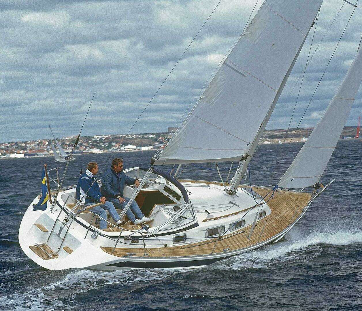 Handrails in teak. Aluminum toe rail. Teak in the cockpit and on bathing platform. Two skylights for the forepeak. Windows have aluminum frames. An opening window over the galley, in the head and two in aft cabin. Two genoa sheet winches Lewmar 40C. Genoa tracks with blocks and return pulleys to sheet winches. Windshield with opening mid-section and sprayhood. There are handholds on the sides of the windshield. Stainless steel rudder shaft with tiller steering. Two Dorade vents on cabin roof. Chain locker forward with space for fenders, and big anchor roller. Integrated swim platform with ladder. Self-draining deck lockers with propane tank.