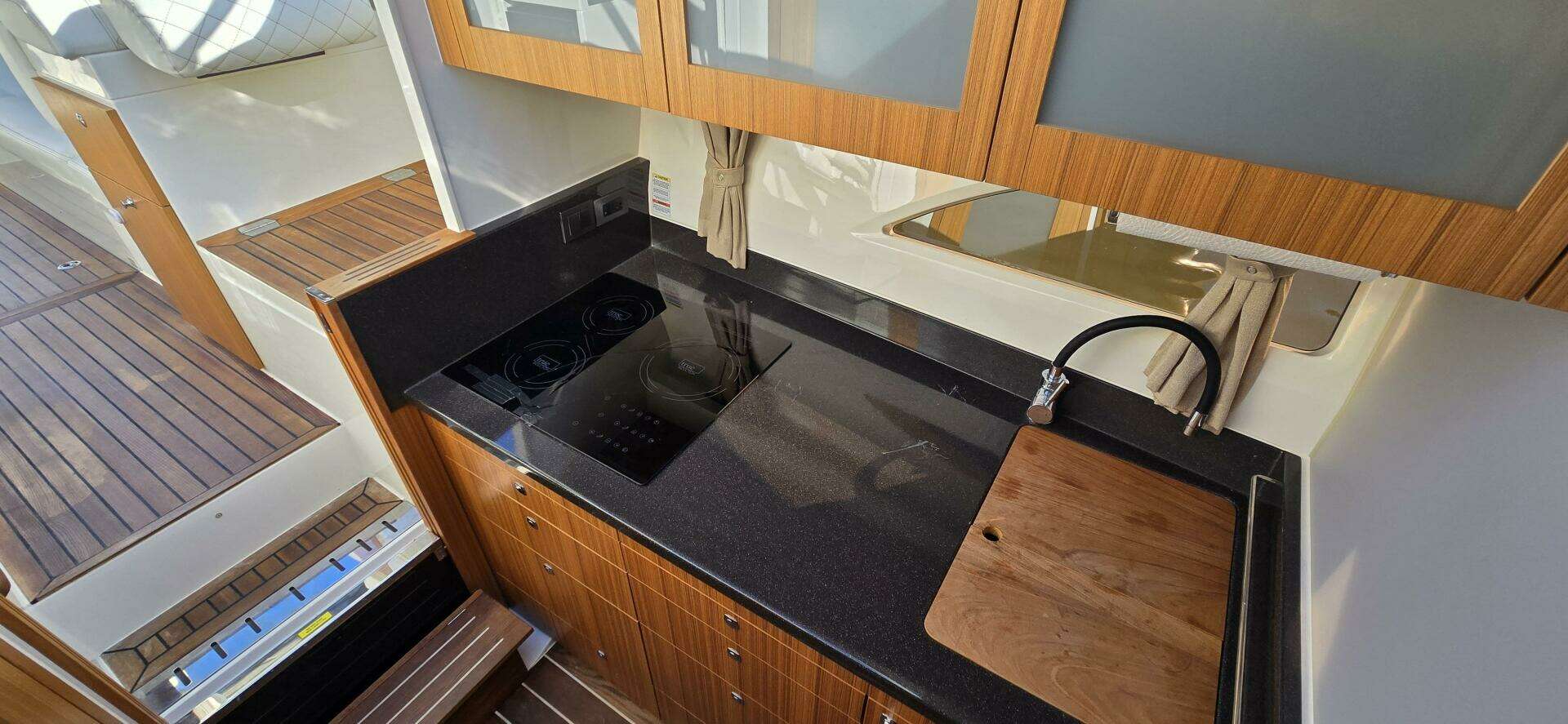 The boat has a uniquely developed companionway door down to the galley. It’s a vast and spacious opening that connects the galley to the cockpit in a social and complementary way. The chef will still be enjoying the company of the sitting group. The opening over the countertop will lead all fumes out when cooking.