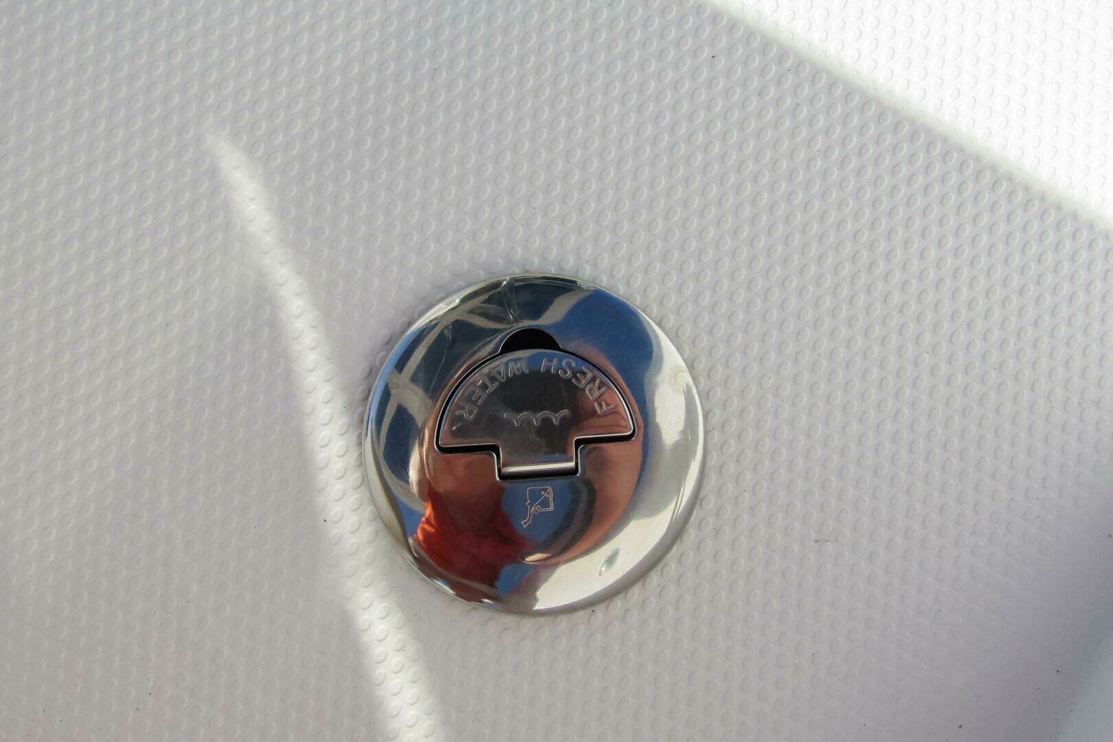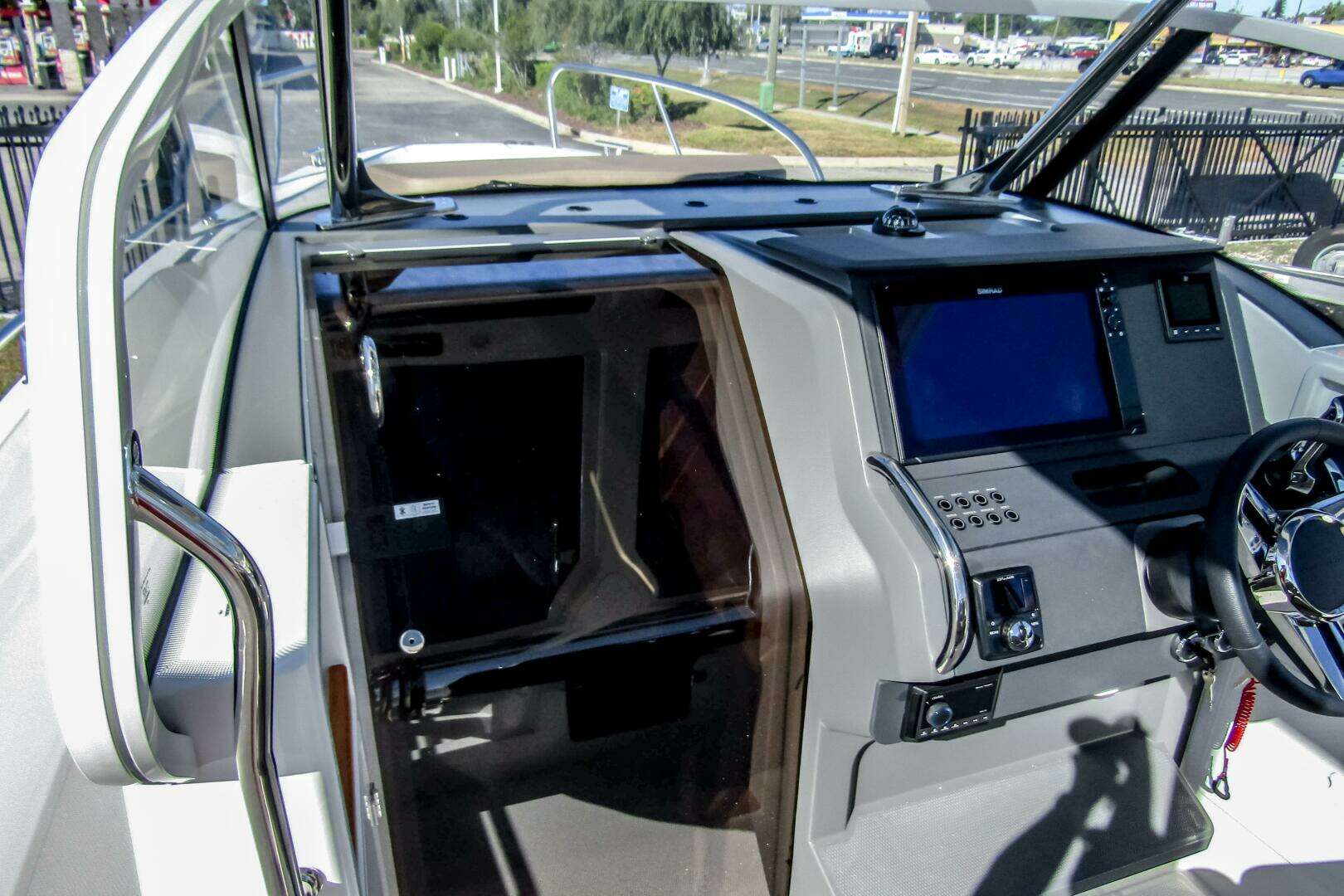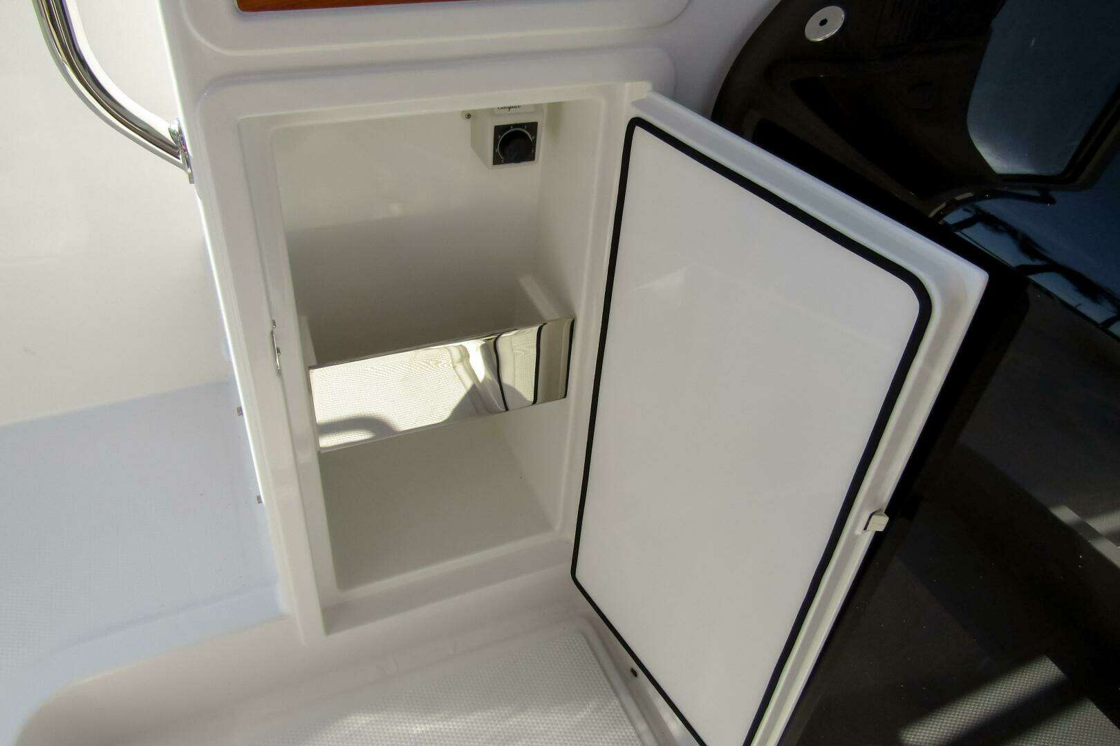 The T9 is equipped with single or twin Mercury outboard engines. The aft deck u-sofa with seating for 5 easily converts to a sunbed. There is an option for a wet bar with a hand basin and portable Weber LPG grill behind the helm seat. The module also functions as support while on the water or in port. The boat is available with three different canopy solutions – harbor cover, spray hood, or as a T-top design. The helm can be equipped with single 9″, 12″, 16″, or twin 12″ chart plotters. The foredeck features a large loading hatch with access to the cabin as well as an optional daybed which creates an extra seating area that seats 4 people with a table or extended sunbed. One smart way to make the most of the aft deck area is spare railing cushions that can be placed on the railing, offering both extra seating and a cozier atmosphere. Below deck is a large berth for two with integrated ventilation, ample stowage and separate head with sink.
