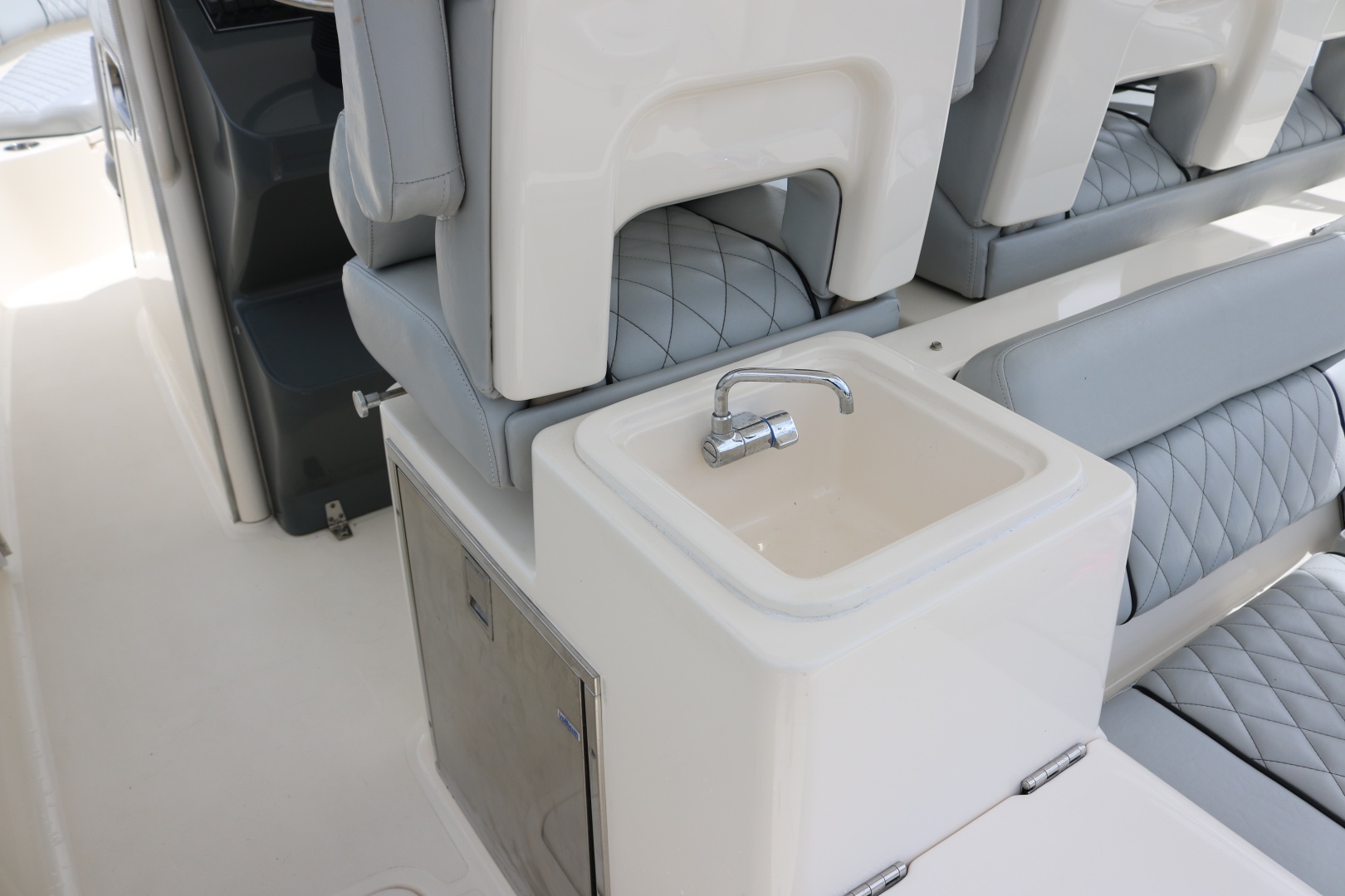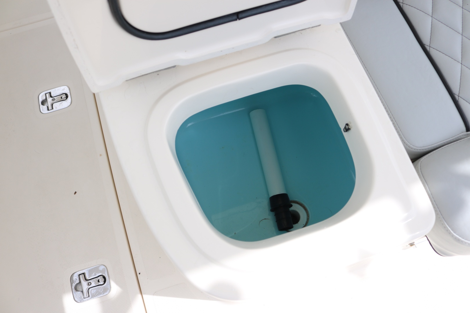 - Insulated cooler under seat with bilge access below