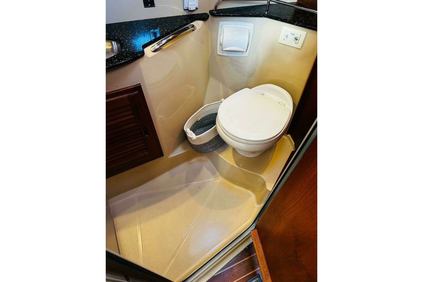 Located under dinette with a folding Lucite door to port upon entry is a quarter berth cabin with a double bed, two opening portholes, two reading lights and a hidden electric toilet under an upholstered bench.