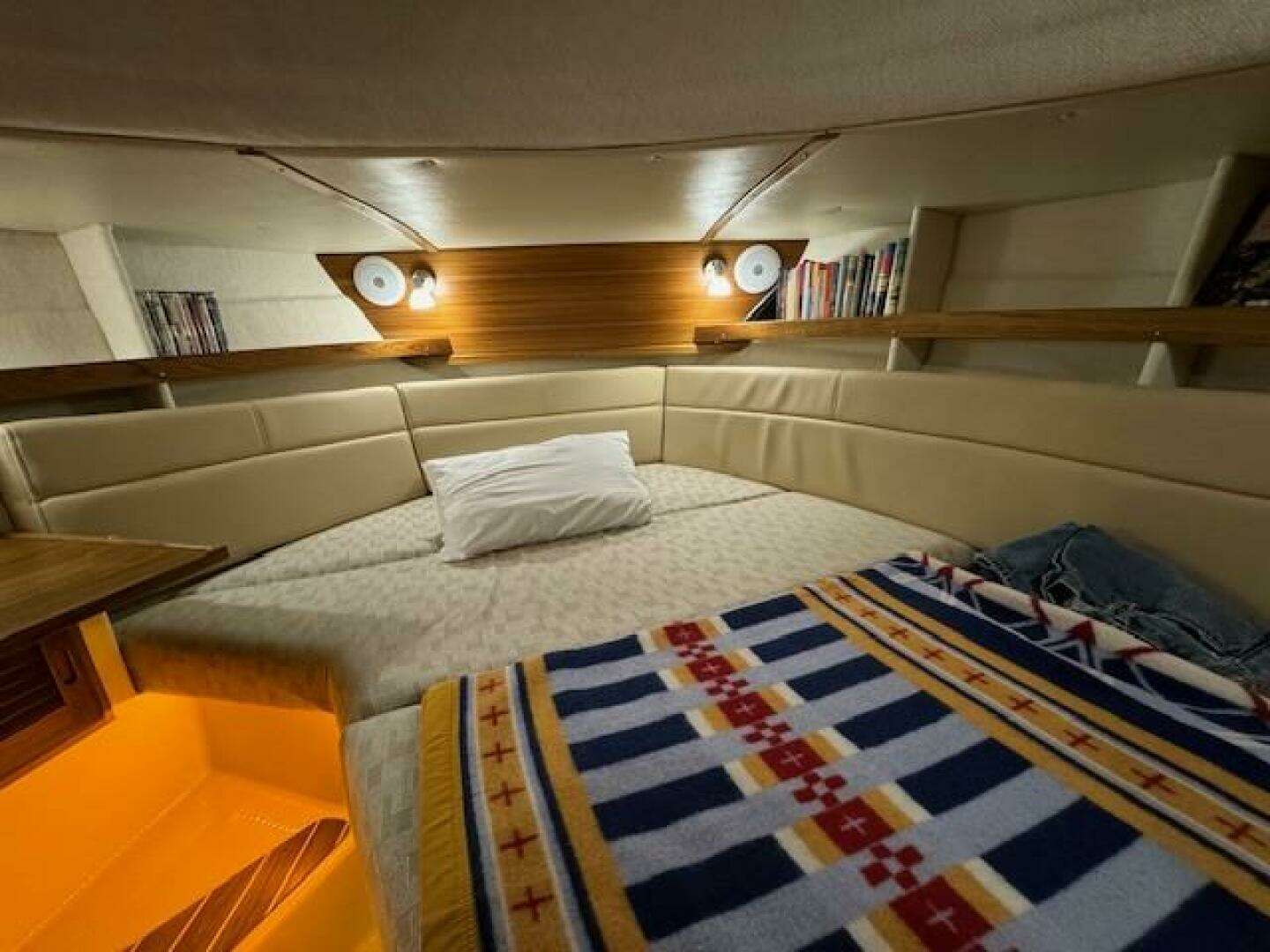 - Midship stateroom, double berth, privacy door, day head