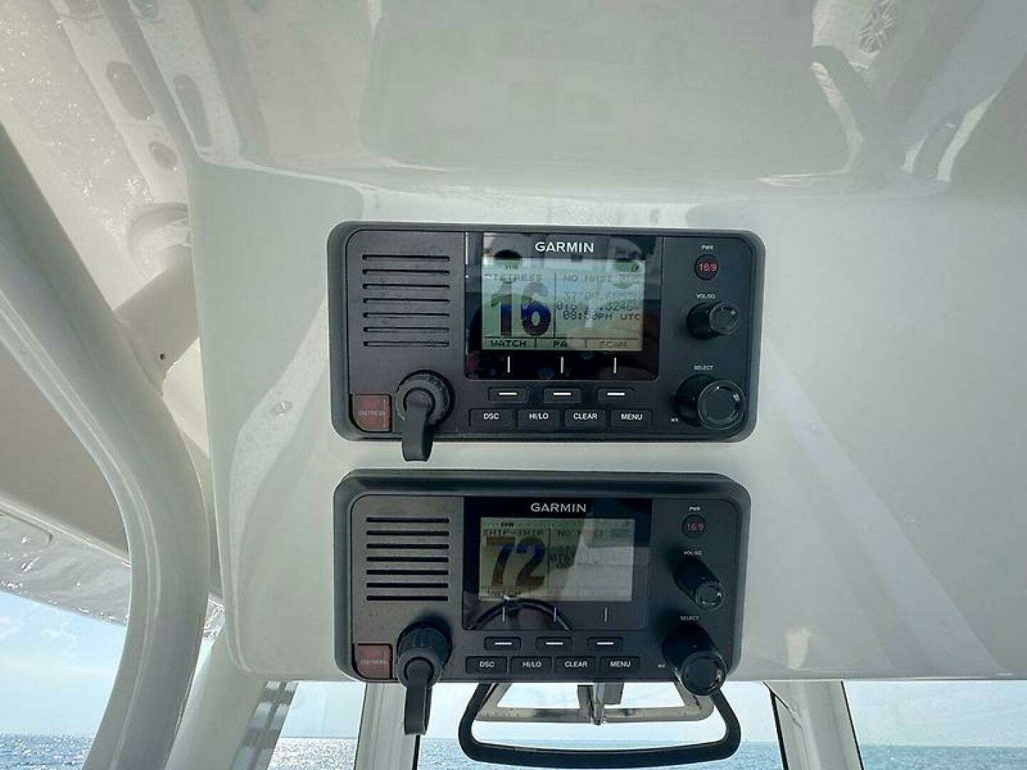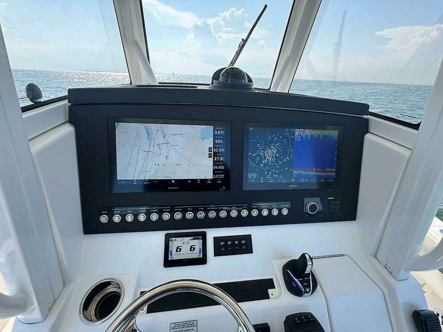 • Premium electronics including dual Garmin large-format multi-touch displays, open-array radar, and full navigation suite.