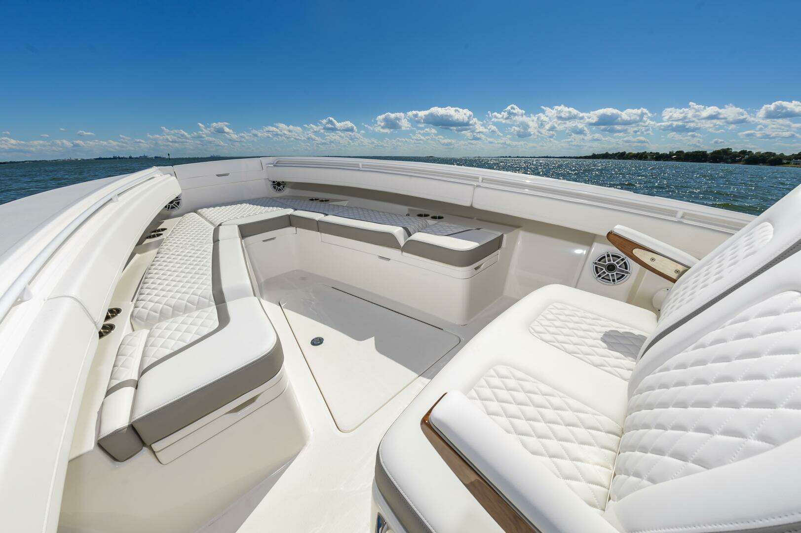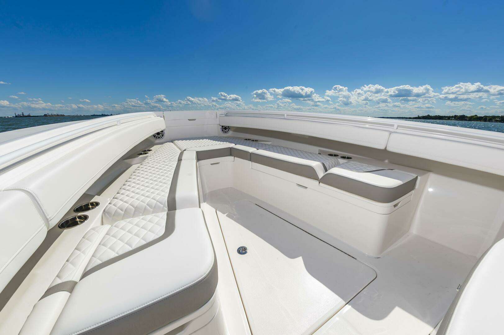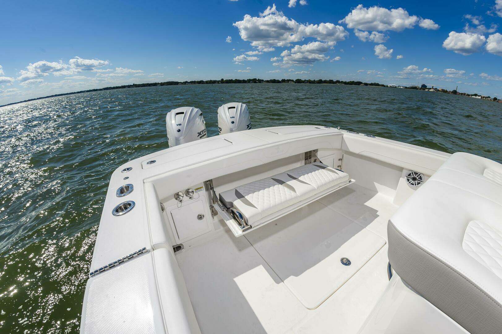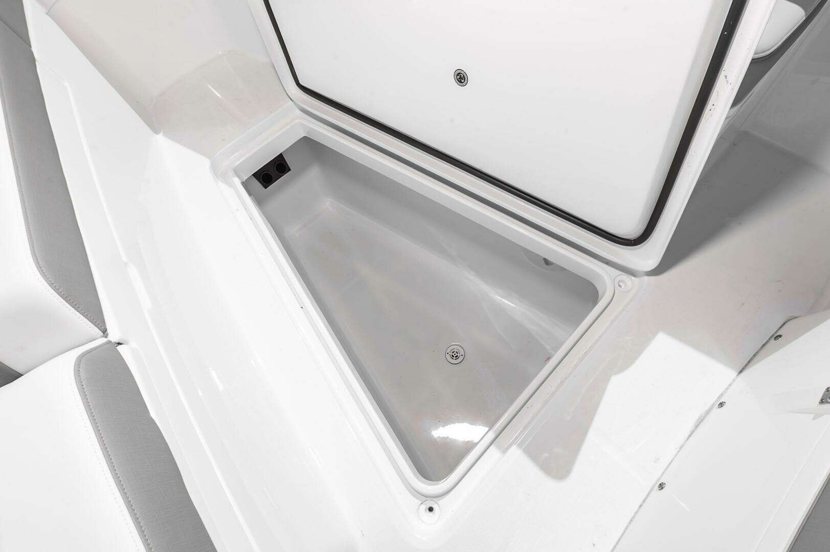- Dual Forward Seat Fishboxes/Dry Storage – Insulated and Illuminated with Overboard Drains, and Center Forward Dry Storage Tub – Insulated and Illuminated