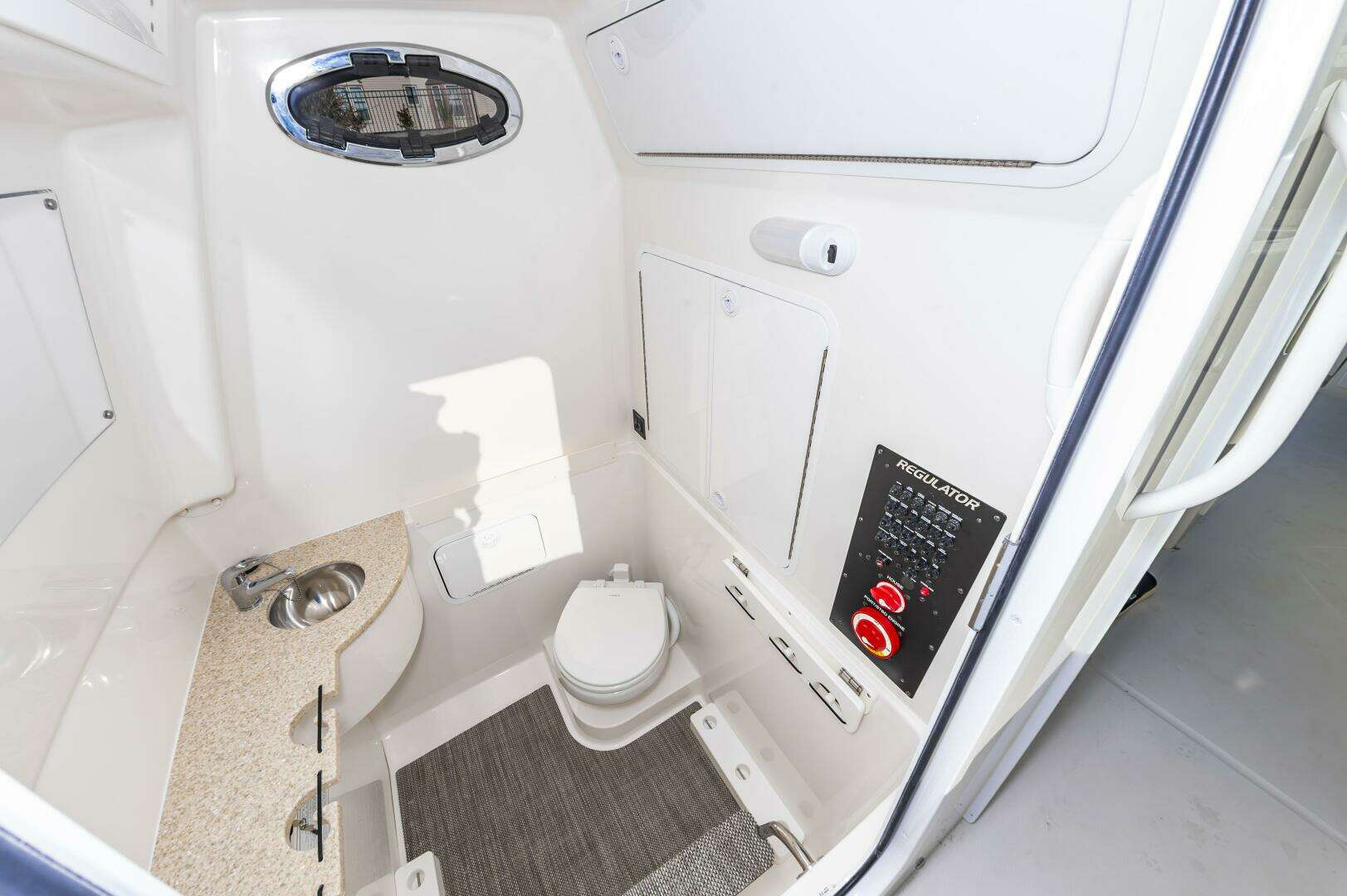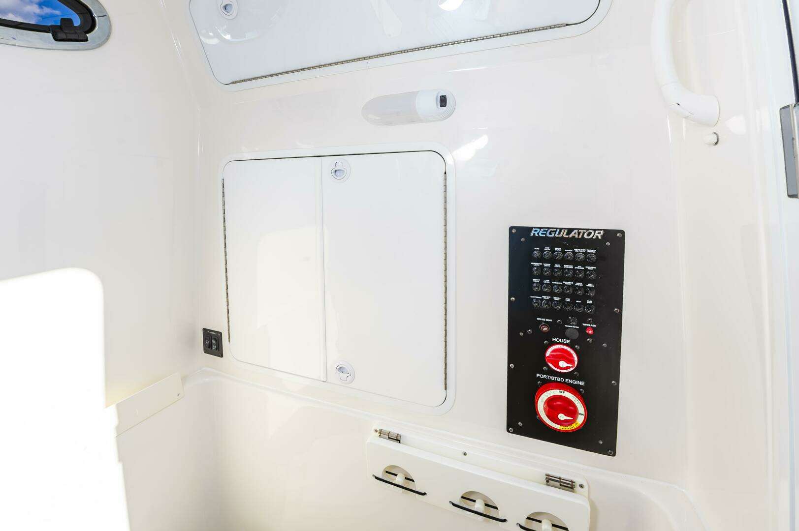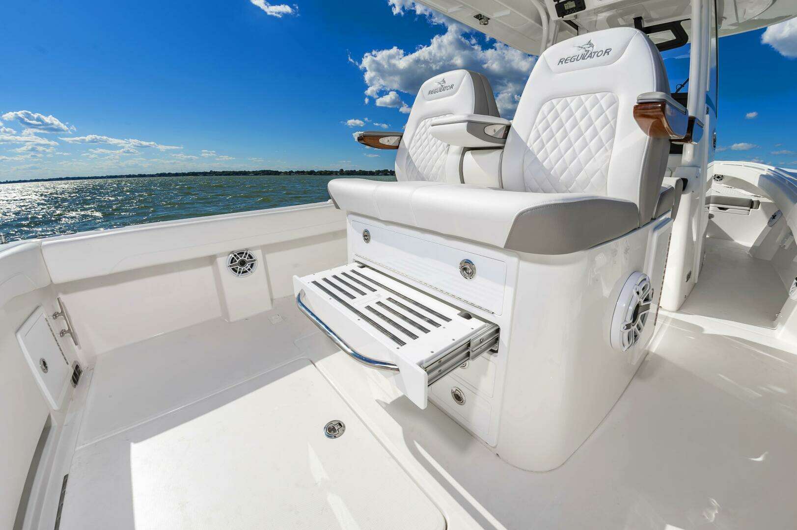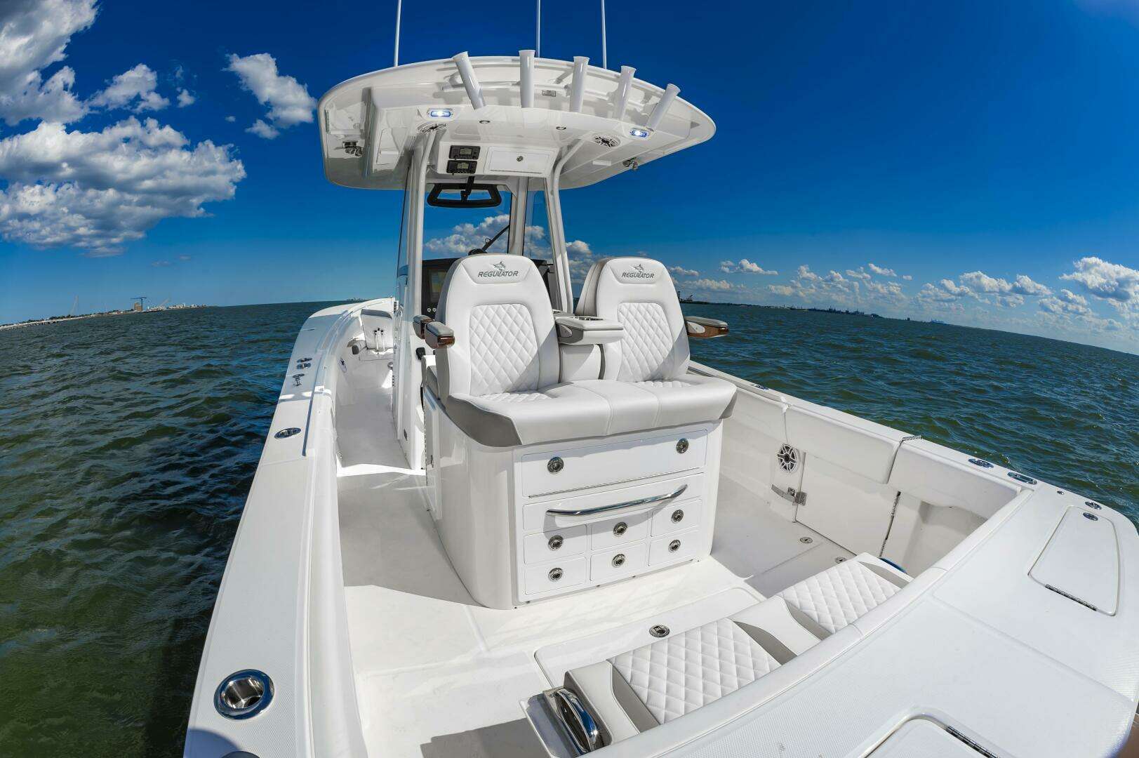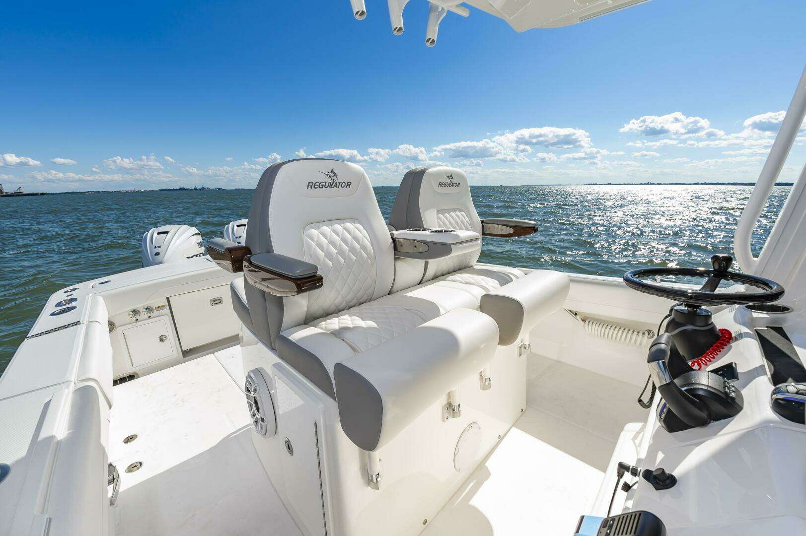 This 2026 Regulator 31 is ready to fish and cruise in style, featuring a factory T-Top & Tower, carbon fiber outriggers, and a deluxe 3X mezzanine tackle center with teak accents and diamond-quilted Dove Gray upholstery. Outfitted with top-tier Garmin radar, dual VHF radios, and a Fusion entertainment upgrade with 10 premium speakers. Fishing upgrades include custom rod holders, gaff storage, and transom livewell/fishboxes. Comfort meets convenience with a windlass, Edson carbon wheel, Phender Pro cleats, and deep gray canvas covers. Turn heads and chase fish—this Regulator is built to perform.