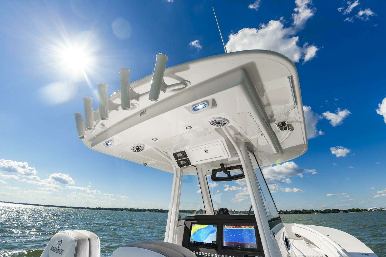 - Fiberglass T-Top with Surfboard Edges, Electronics Box, Integrated Navigation/Dock Lighting, Spreader Lights, and Multi-Colored LED Lights – Complete with Integrated, Vented, Wraparound Windshield and Windshield Wiper/Washer
