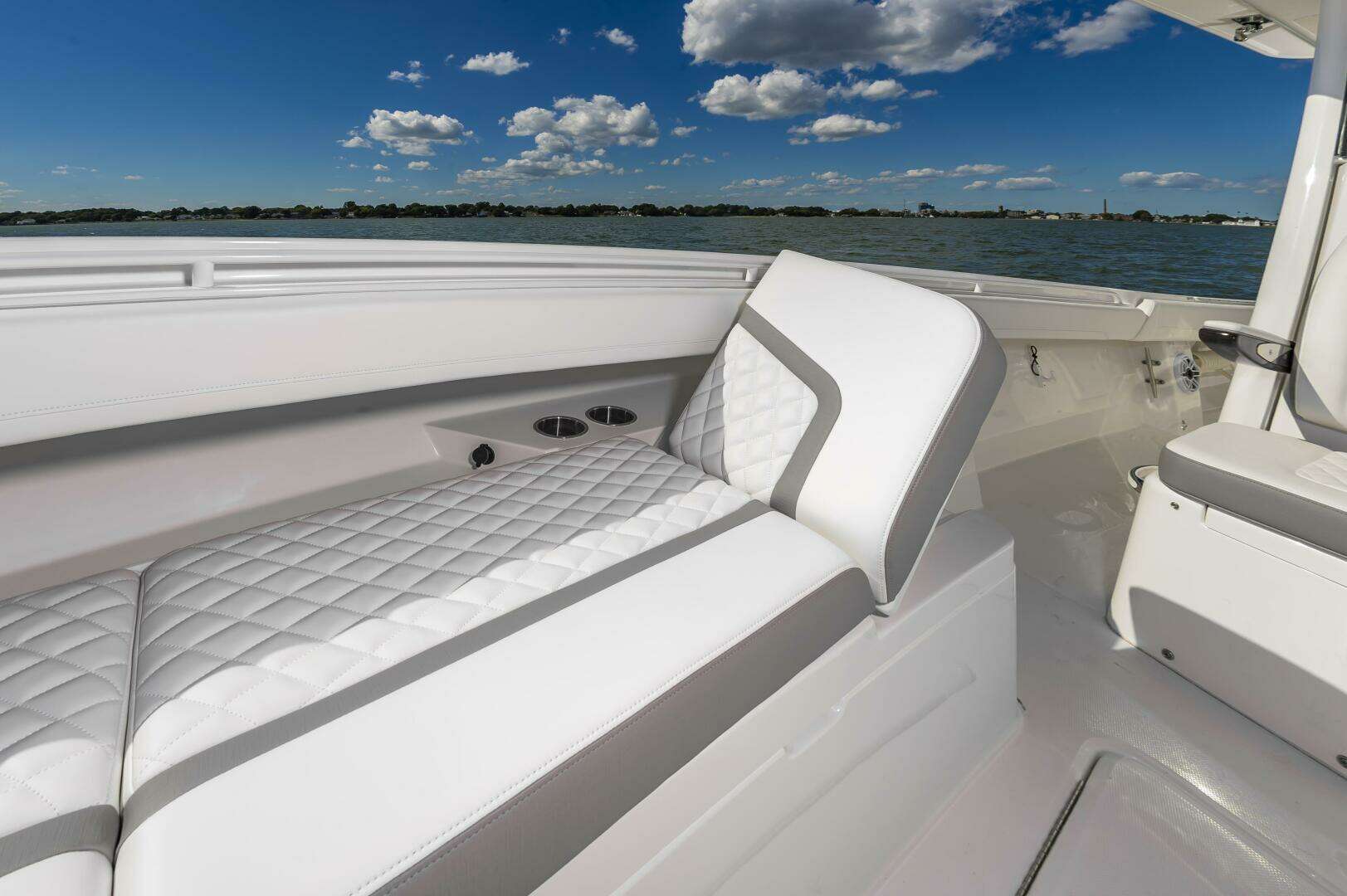 - Diamond quilted upholsteryTeak accents on helm armrests, forward console armrests and mezzanine seat armrests (Only available when 3x mezzanine seating is chosen; Not available with teak ladder-back option)