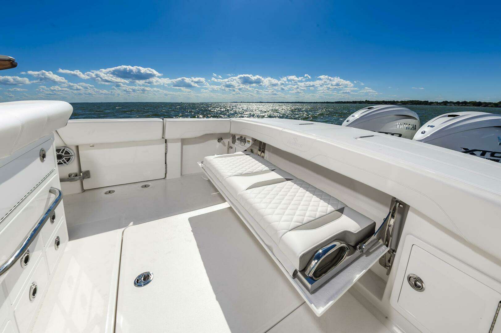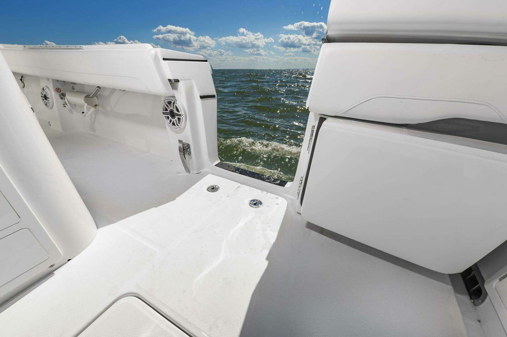 - 3X Deluxe Mezzanine Tackle Center Aft-facing Mezzanine seating for two with recessed footrest, folding armrests with (2) cup holders and tackle storage. Option to add dual-flanking seatside rocket launchers (In lieu of standard)
