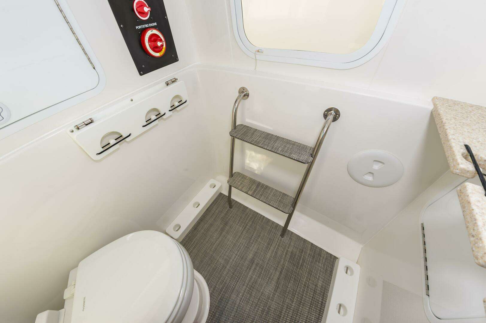 - Stand-Up Head Compartment with Electric Head, 6 gal. Holding Tank, Interior Lighting, Mirror, and Electric Tank Pumpout