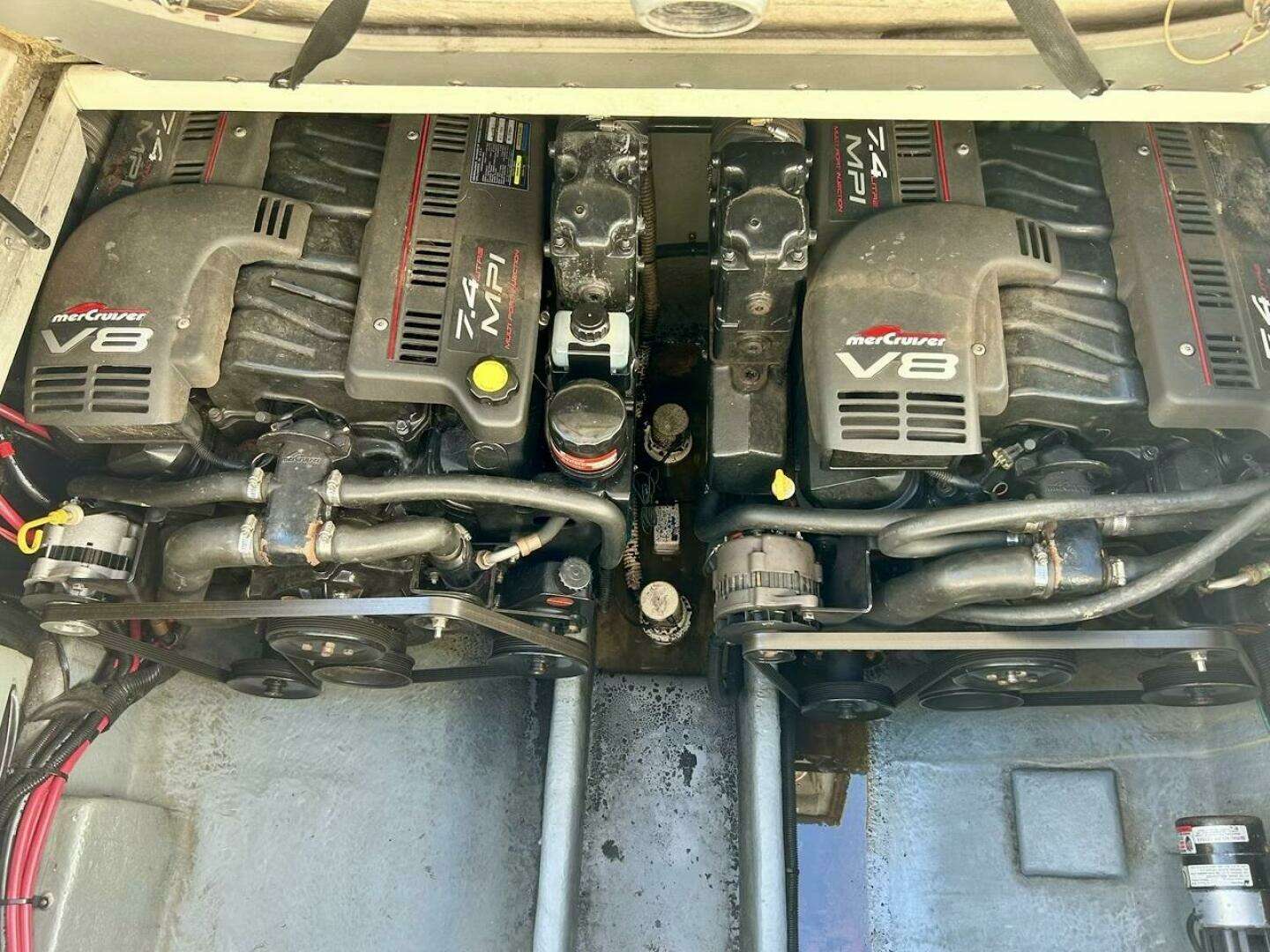 With twin 7.4L MerCruiser big block engines producing a combined 620HP, this Sundancer has the power and performance to match her looks. A bow thruster adds effortless maneuverability, making docking and close-quarters handling easy even for newer operators. The spacious cockpit features a comfortable double helm seat for relaxed cruising, and the aft seating area easily converts into a large sunpad—perfect for lounging. A wet bar and cockpit refrigerator complete the entertainment setup. A portable generator is also included for power on the go.