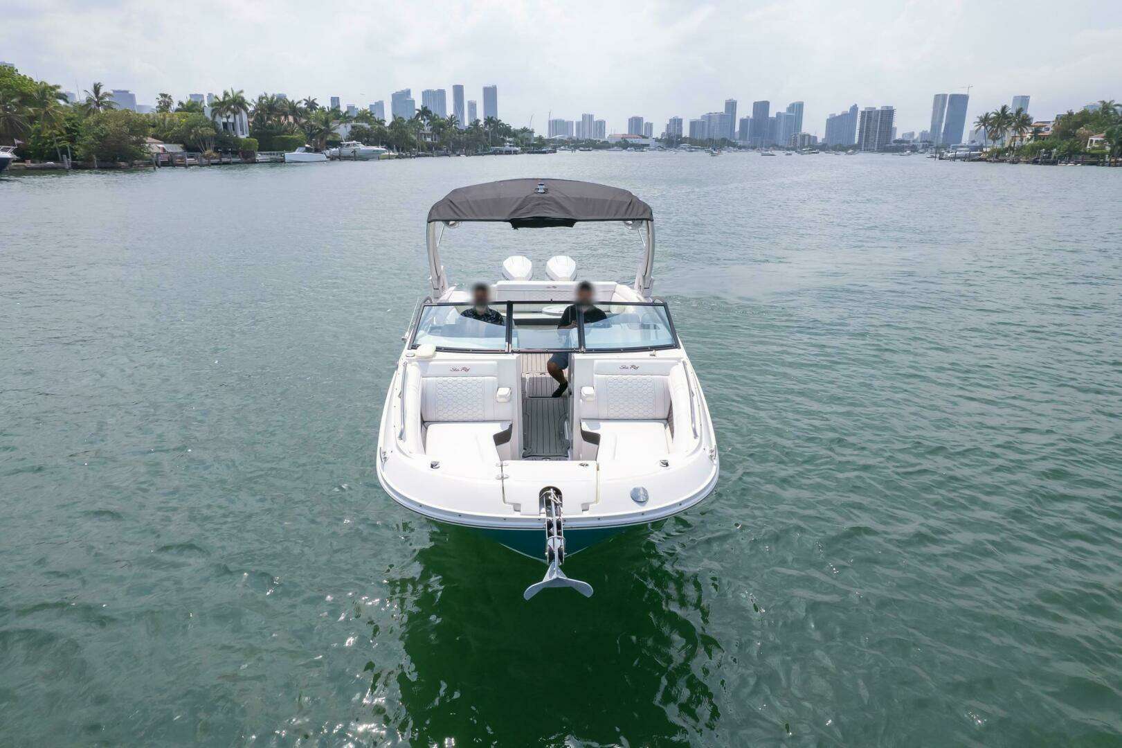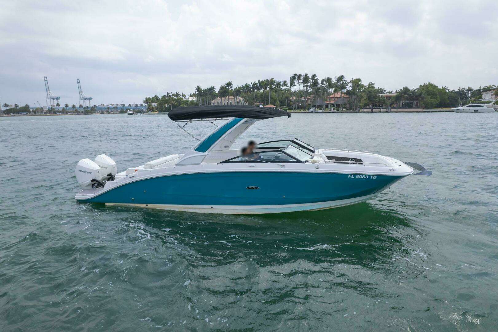 2022 Sea Ray SDX 290 OB in Kingfisher Teal. Twin Mercury 200 V6 with joystick, Platinum warranty to 1/7/2027 (+ Brunswick cosmetic/components to 1/5/2027). Premier stereo, windlass, tower w/ bimini, covers, Seadek, VHF, pump-out head. Miami Beach, FL. Priced at $175,000.