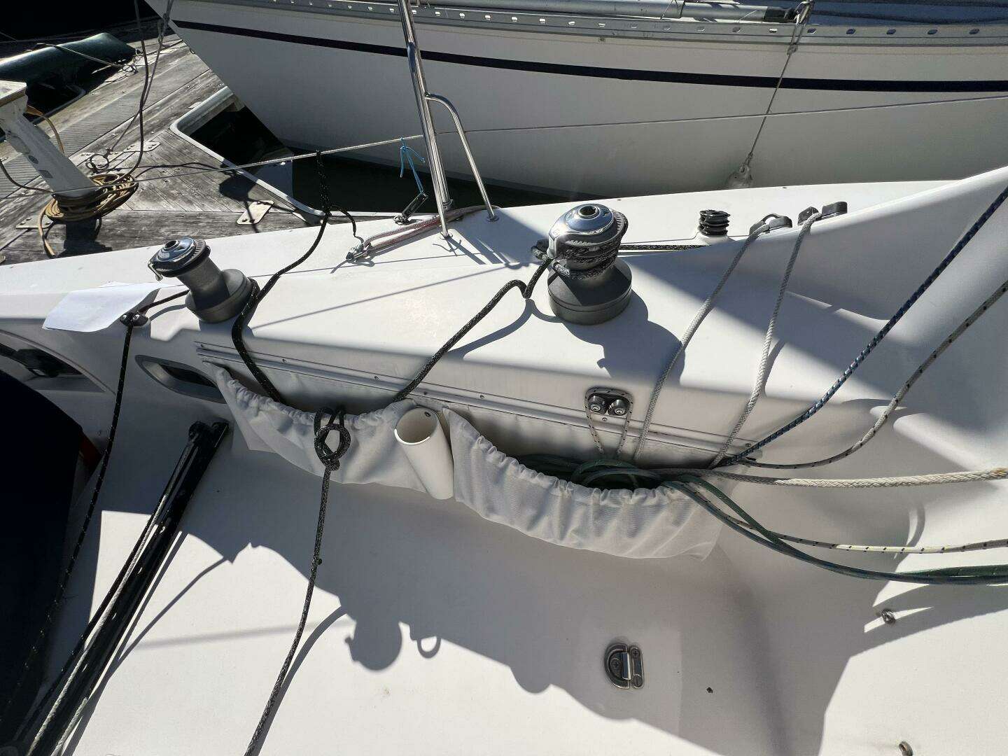 - Stainless stanchions with double life lines and custom line work forward for holding spinnakers.