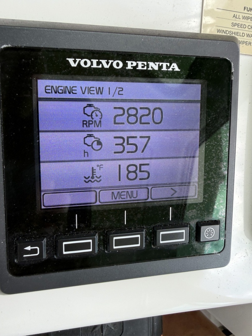 BELLA FAMIGLIA is powered by the Optional VOLVO D6-435 Turbo-Aftercooled (6) cylinder marine diesel that's rated at 435 HP at 3,500 RPM's. With this engine, the owner reports a 23-24 knot cruise at some 3,000 RPM & a top end at WOT (3,500 RPM) of 27-28 knots.
