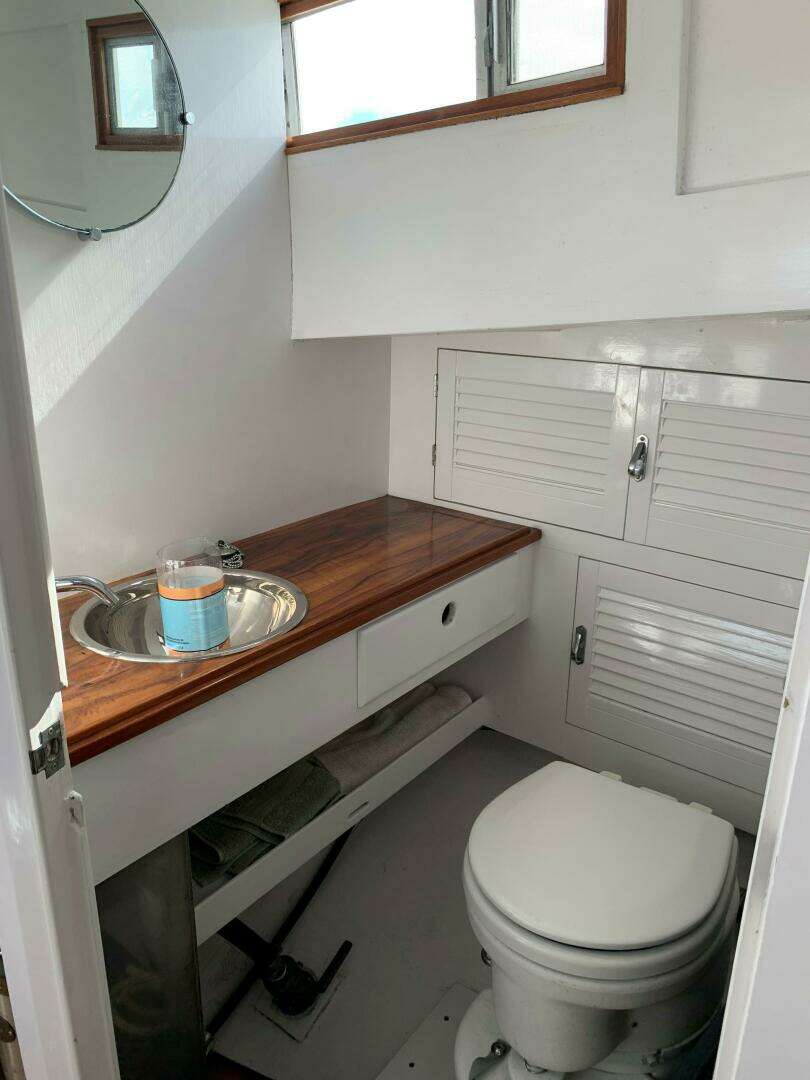 Forward of quarter berth is an enclosed / private head area with under deck storage lockers, varnished African Mahogany counter top, under-counter drawer storage, Airhead composting toilet along with polished stainless steel Vola sink basin, faucet and towel bar