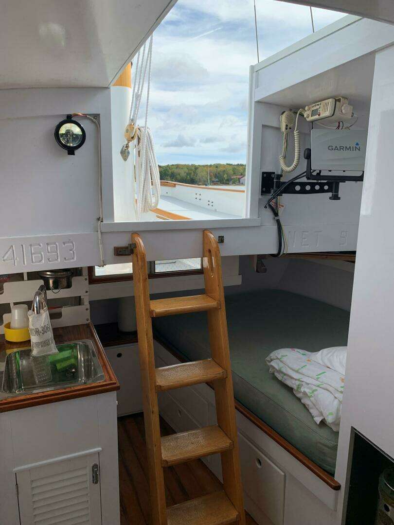 Opposite (to starboard) of the quarter berth and had areas is an expansive galley area. Counter tops are varnished African Mahogany with drawer and locker storage under counter and additional storage above, outboard and aft of the counter tops with specialized storage. Cooking is done with a gimbaled Broadwater propane 4-burner stove with oven and perishable foodstuffs are kept cool in a well-insulated ice box accessible from both and galley and on deck. For clean-up duties the is a polished stainless steel sink basin with Vola faucet suppling pressure water for the clean-up crew.