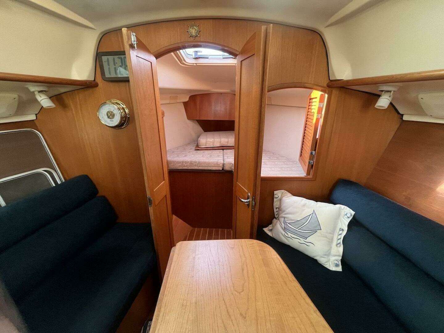 Below decks, the interior is surprisingly spacious thanks to generous beam and clever layout. Two private staterooms with solid bulkheads provide comfortable sleeping quarters, while a well-appointed salon offers ample seating and storage. The dinette converts to an additional berth, enhancing flexibility for guests or family.