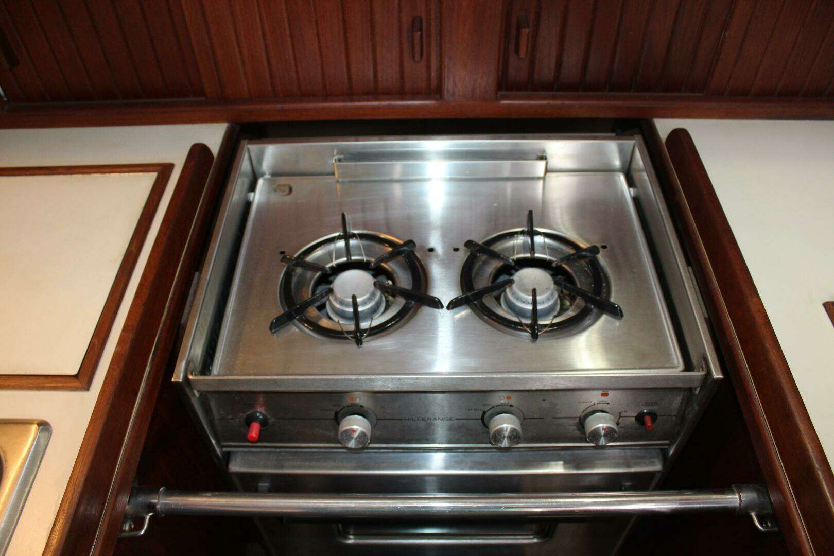 The galley is to starboard of the companionway. Island Packet is well-known for their excellent galleys with superb dish storage and plenty of counter space.