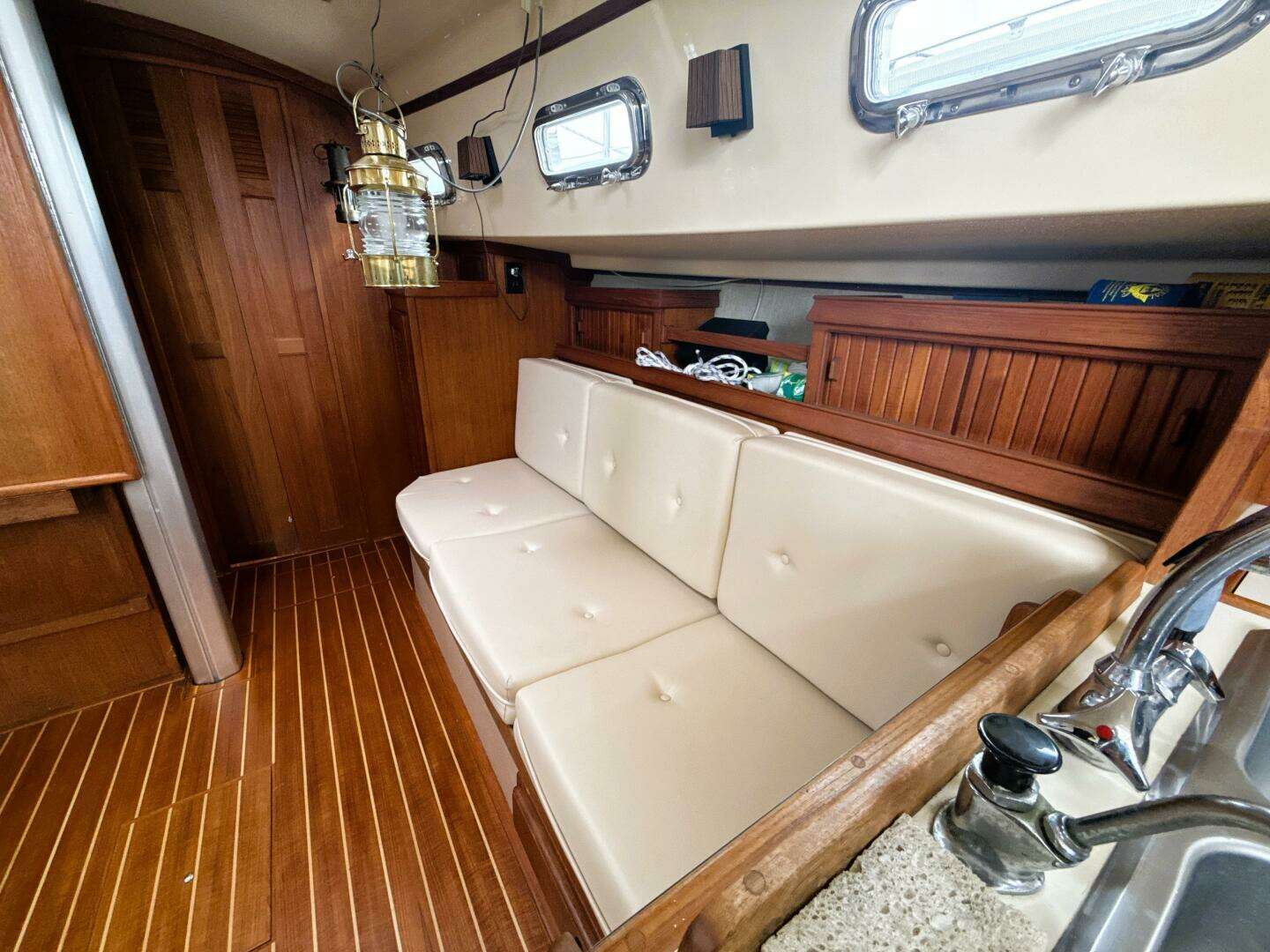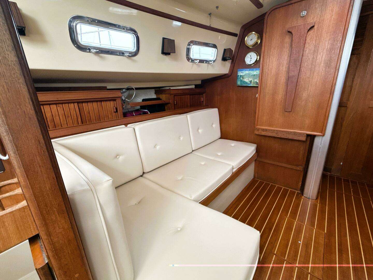 In the main salon, there are two settees that make it possible to sleep up to three additional people. The port side settee pulls out to convert to a double berth; the starboard settee serves as a single berth. Teak cabinets and book shelves are outboard of settees, with large stowage areas behind and under each settee.
