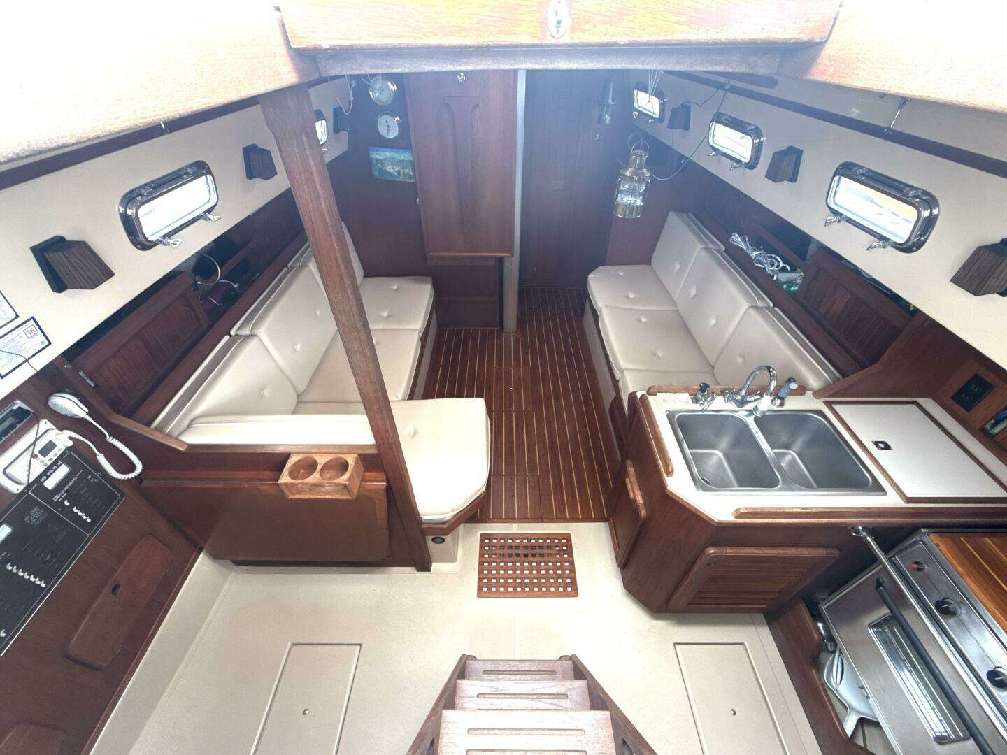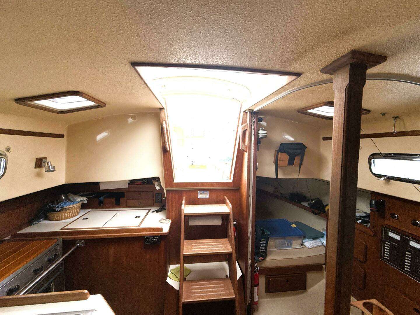 - Molded slip-resistant cabin sole adjacent to the companionway, galley & aft cabin/nav station, with a draining grate in front of ladder (teak grate lifts out for cleaning)