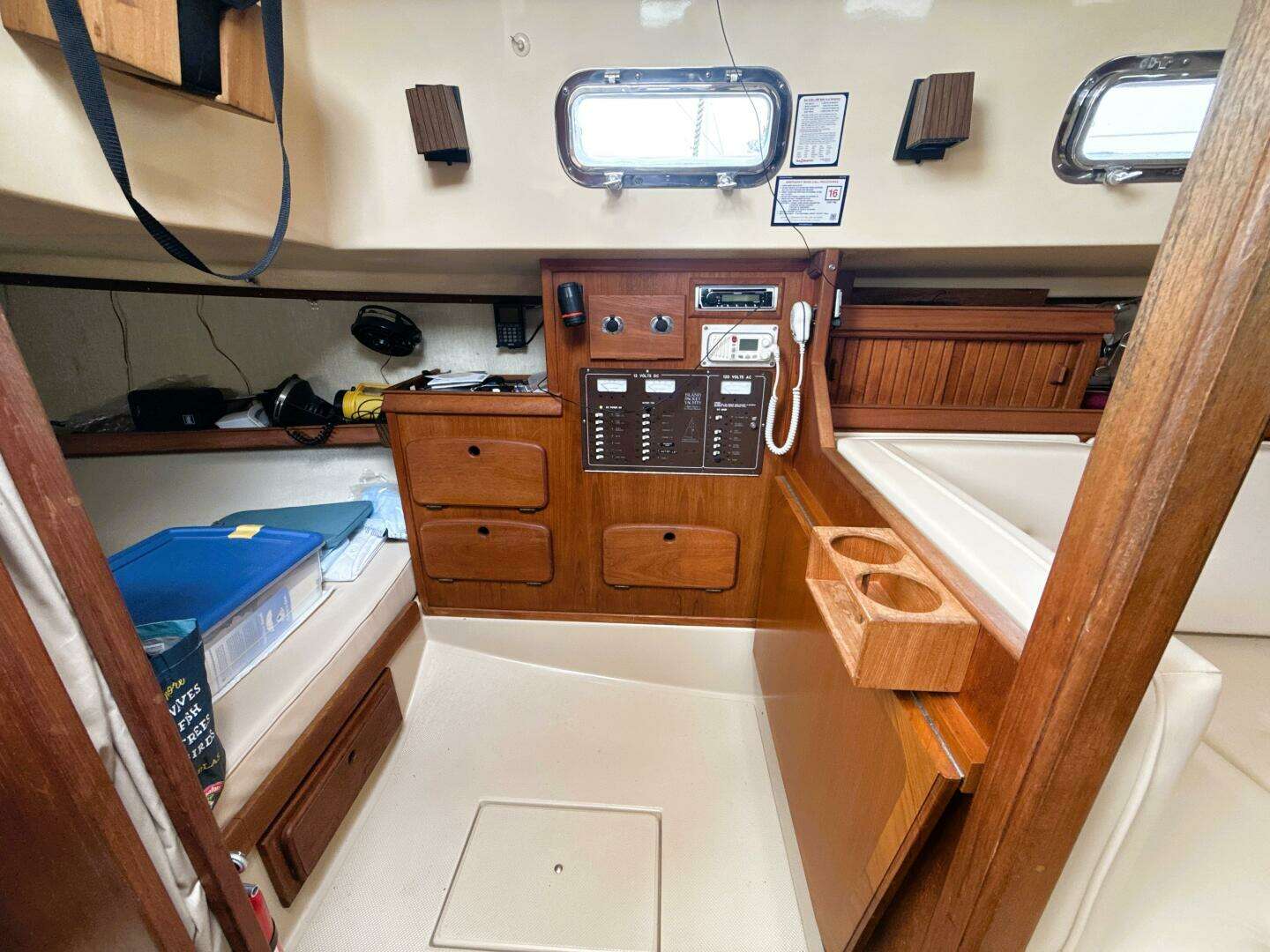 The navigation station has a large hinged table, pull-out seat, generous nav/electronics cabinet w/master AC/DC electrical panel, plus room for a variety of owner-installed equipment. There is a chart stowage drawer beneath settee.