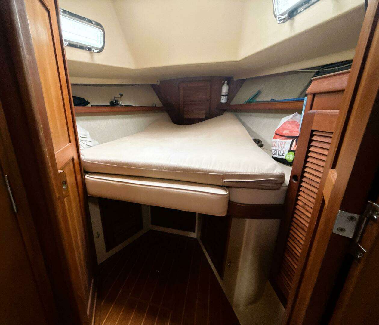 There is a 6'6" V-berth with storage under in the owner's stateroom forward. To starboard there is a hanging locker and cabinet. Access to the anchor locker is forward. An opening overhead hatch and two opening ports provide light and air.