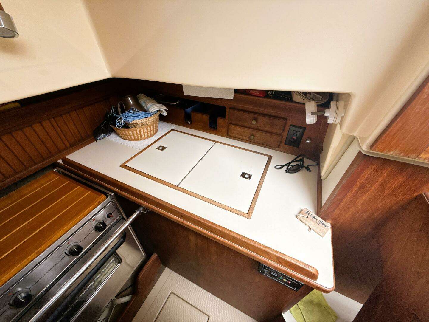 In the starboard main salon is the large U-shaped galley, with Formica® countertops with teak sea rails on all edges and a flip-up counter extension, plus ample storage.
