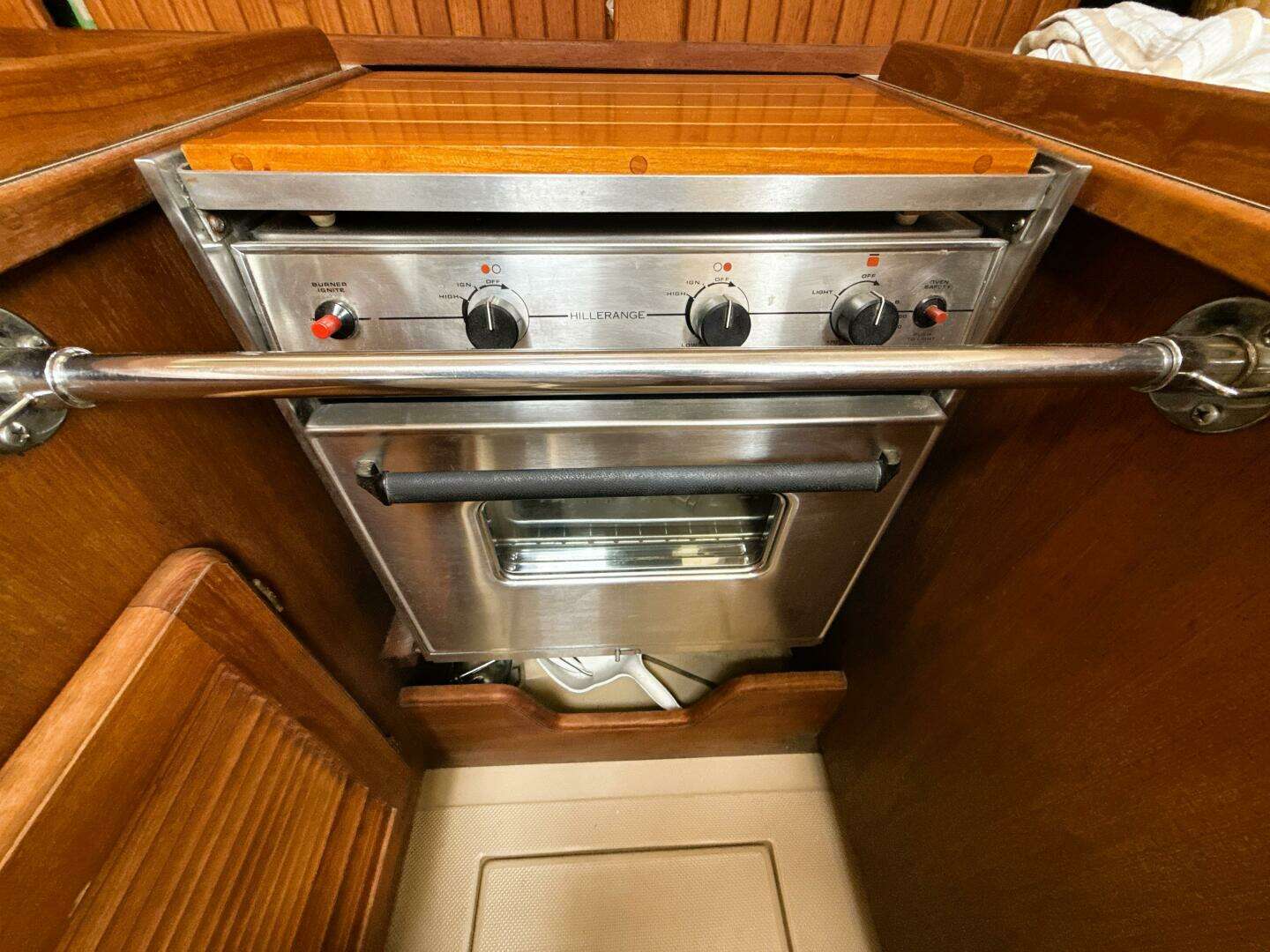 - Hillerange two-burner LPG gimballed stove w/oven – S/S deluxe safety type, teak cutting board cover, S/S guard rail w/harness hooks