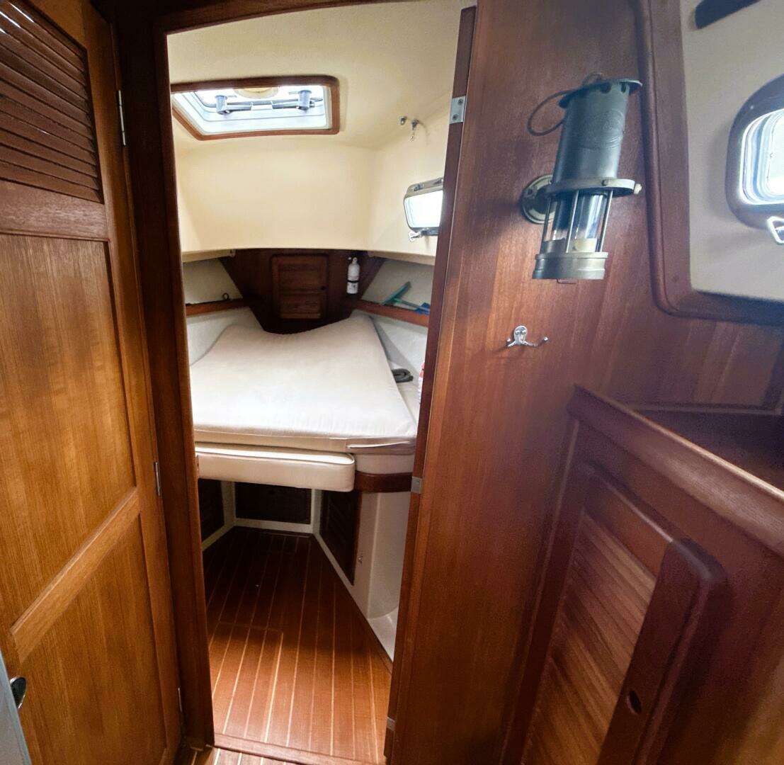 Forward cabin with large double V-berth, full length teak shelves outboard, large stowage lockers, cedar lined drawers under. Generous cedar lined hanging locker w/ shelf over. (2) opening ports, plus overhead hatch and varnished teak & holly sole. Privacy door to main salon and private access door to forward head.