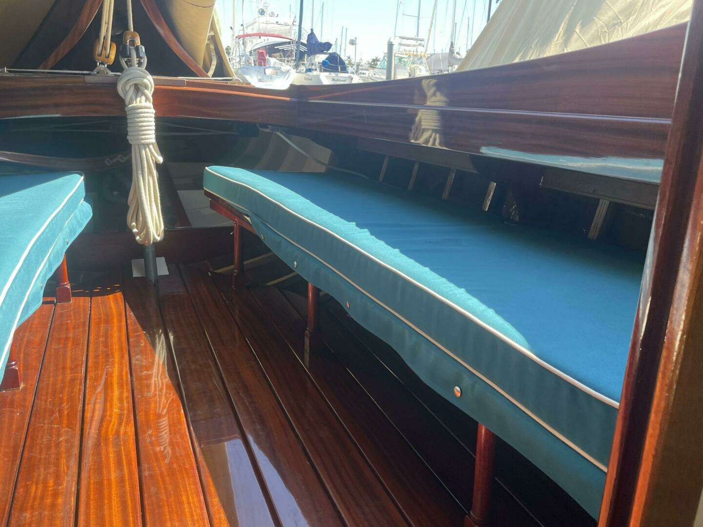 ● Cockpit seating and sole replaced with sapele mahogany to match cockpit curvature.