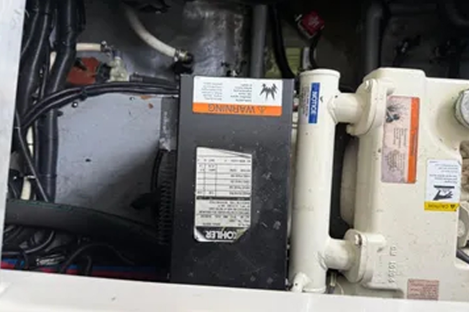 Open plan cabin boat. Large L shape dinette sofa. Spacious forward berth. Full service galley with microwave, and coffeemaker. Three overhead hatches, and five opening ports provide good cabin ventilation. Well designed cockpit has wraparound lounge seating aft, wet bar, and double wide helm seat. Note walk through windshield and aft fender storage. Twin Volvo Penta 5.7 GSi sterndrive power. Kohler generator, 5kw. Full canvas camper enclosure and ice maker complete the cockpit space.