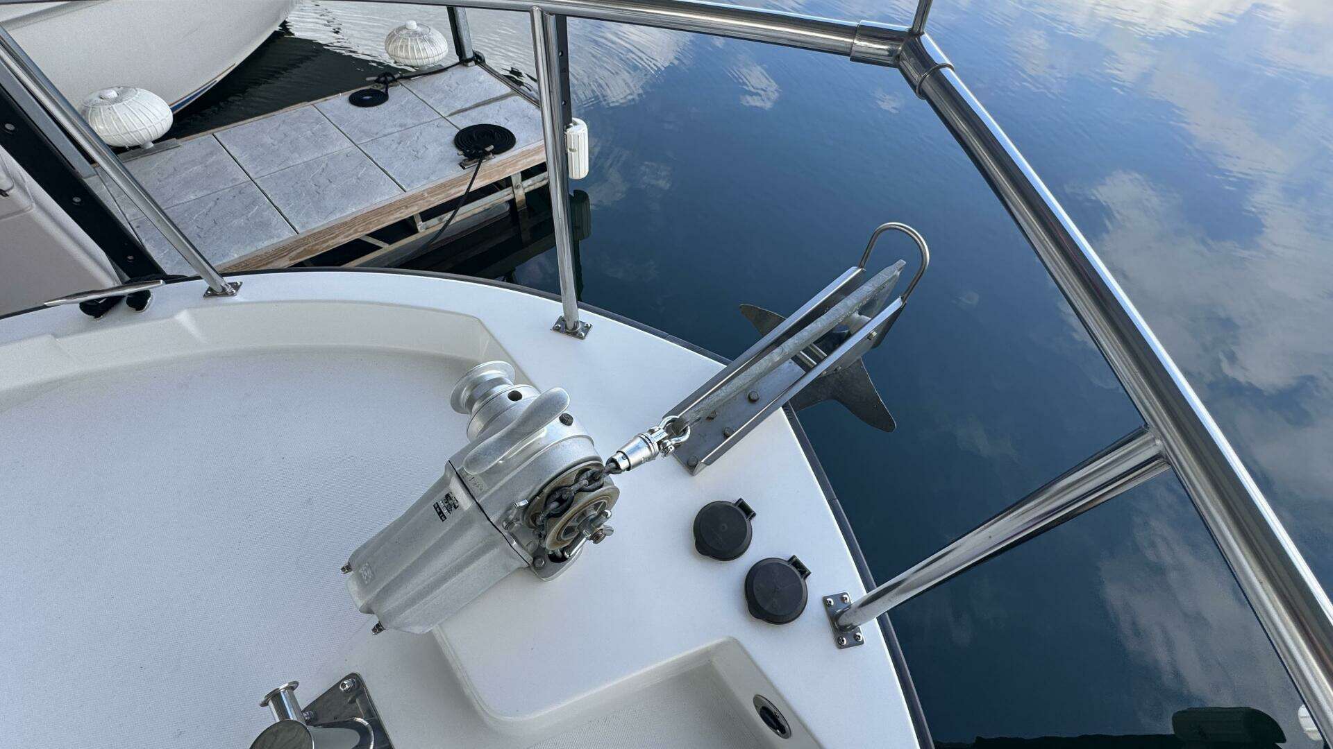 On deck, Clover is well equipped for serious cruising. The ground tackle includes a 33-pound Bruce anchor with 30 feet of 5/16" chain and 200 feet of three-strand nylon rode, deployed via a Lofrans Tigres windlass. A storage box was added in 2023, and a new bimini was installed the same year. In 2025, the cockpit received new canvas. The doors and insets were professionally prepped, primed, and painted in 2023, and the vessel has received multiple compound and wax treatments, most recently in April 2025 with P&S carnauba and polymer protection.