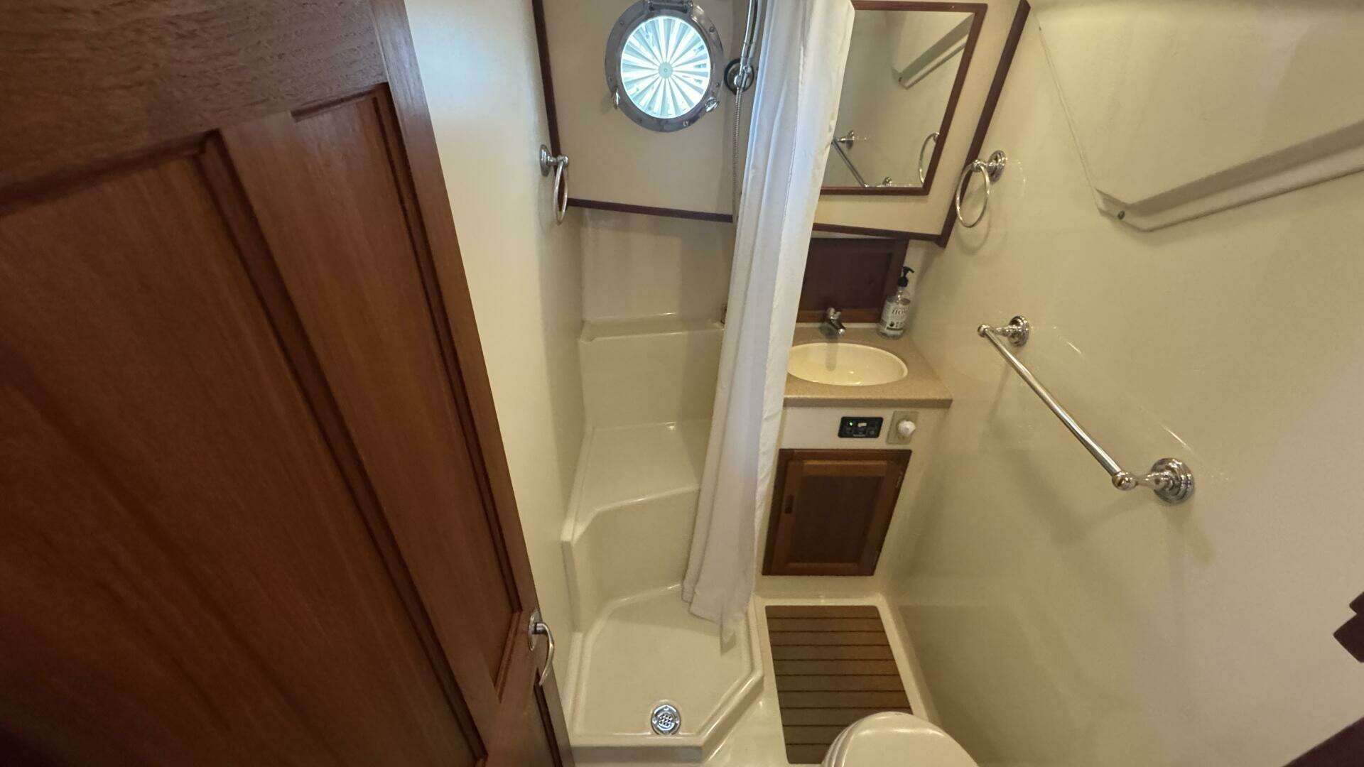 Forward, the private stateroom features an island berth with generous storage. The head includes a large separate stall shower—an uncommon feature in a vessel of this size and a significant comfort advantage for extended cruising.