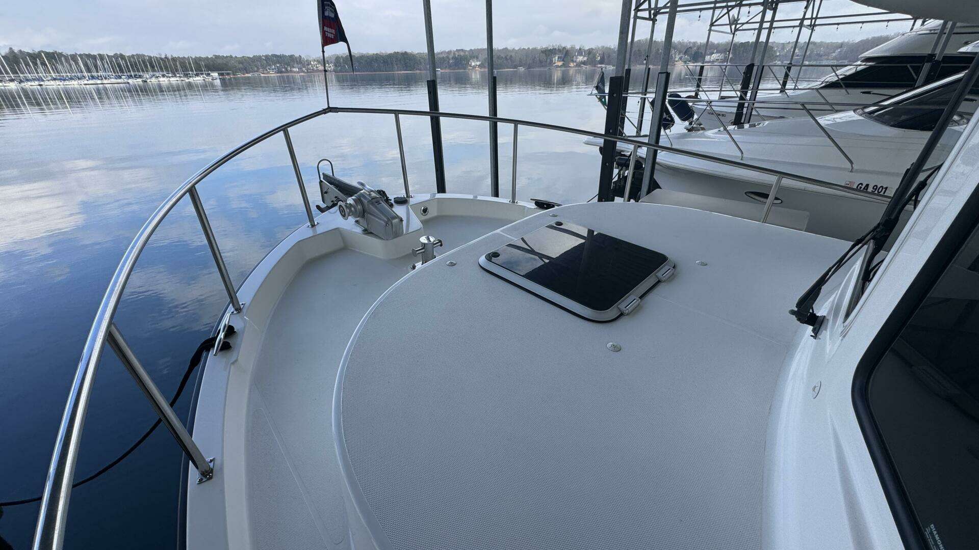 Forward and slightly up is the raised pilothouse with commanding visibility, comfortable seating, and excellent access to navigation and engine controls. Moving down from the salon, the forward stateroom features an island berth and private access to the head with separate stall shower—an outstanding layout for extended cruising.