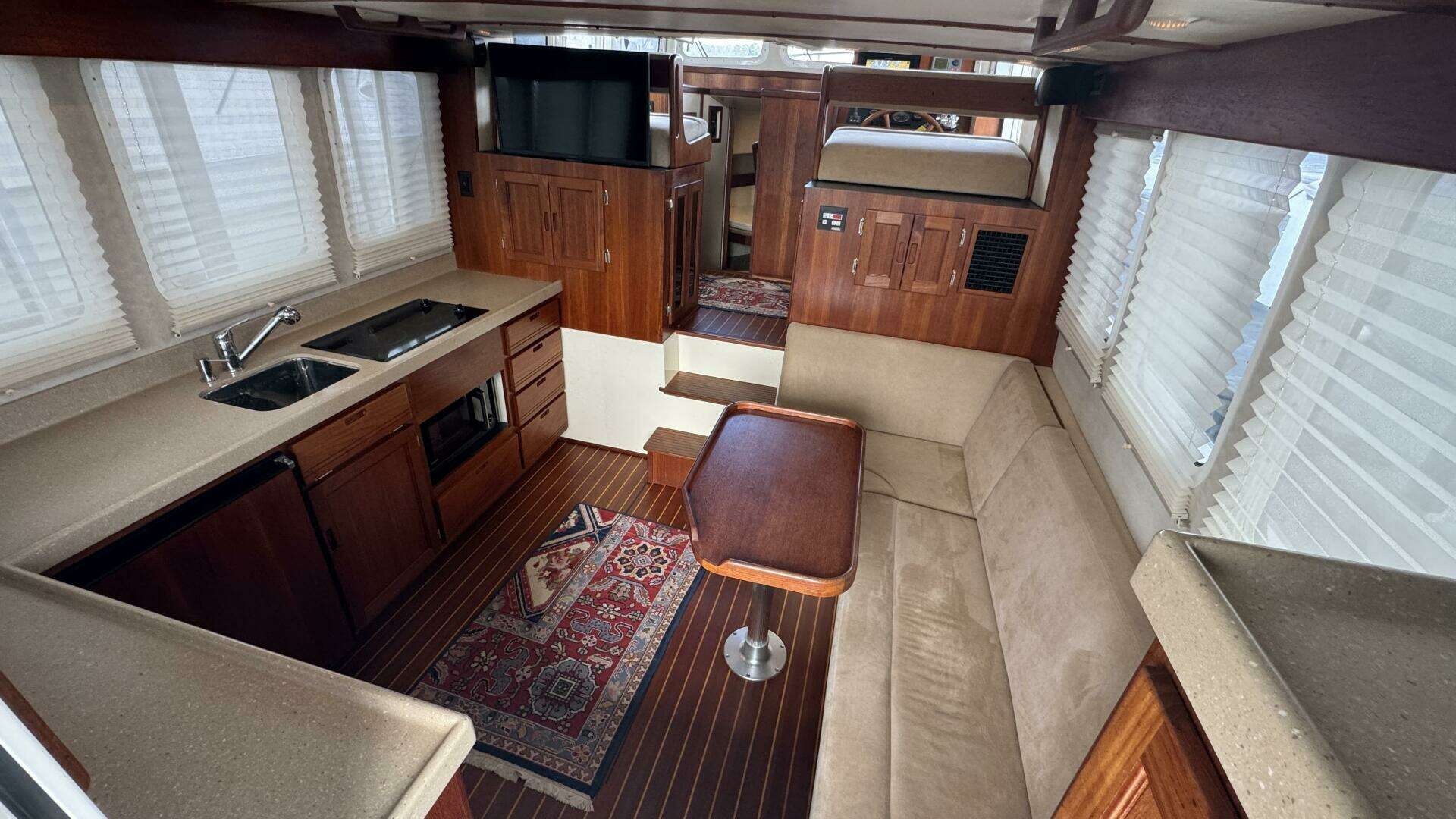 Boarding Clover is easy and secure via the cockpit, where wide side decks and tall stainless railings allow safe movement forward. The cockpit is protected by new canvas (2025) and benefits from a recently installed bimini and added deck storage box. From the cockpit, a few steps lead into the main salon, where warm wood tones, excellent natural light, and thoughtful upgrades create a welcoming atmosphere.