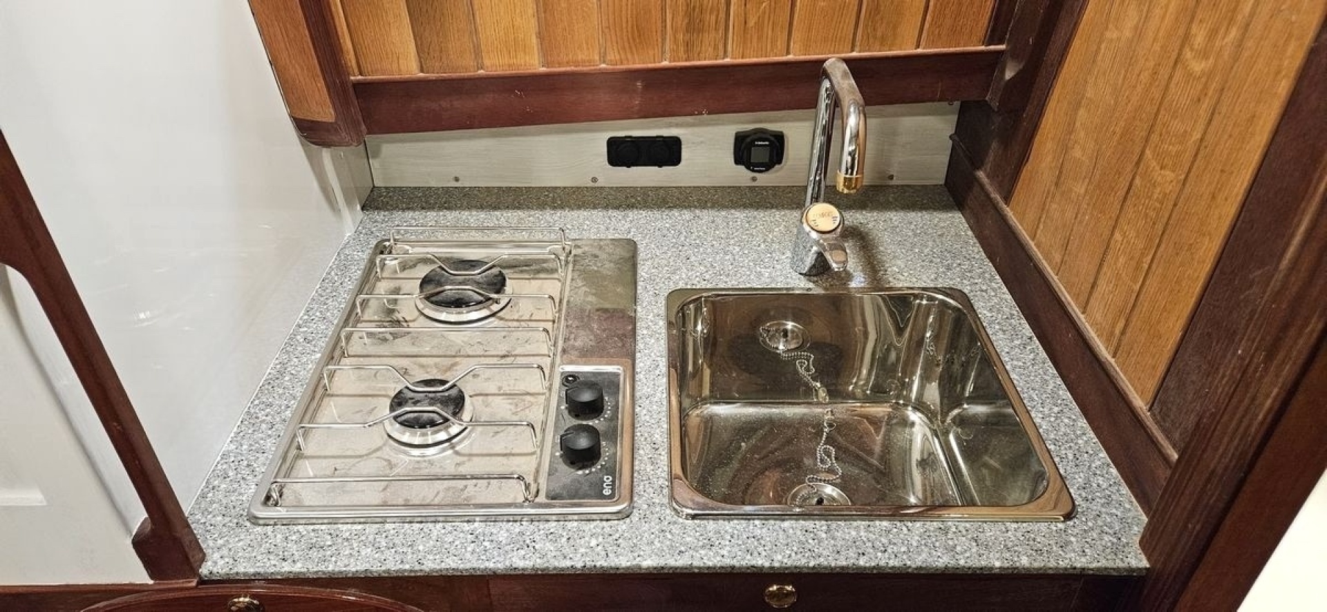 The interior is finished to a highly custom standard, featuring satin-varnished oak and mahogany, white matted tongue and groove overheads, a teak-and-holly sole, and extensive bronze and stainless hardware. Warm, functional, and purpose-built for real use aboard.