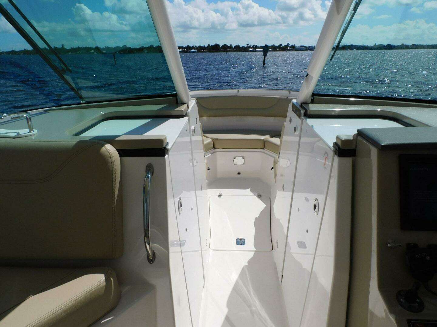 - Molded forward bow seating with flip-down armrests and insulated storage below