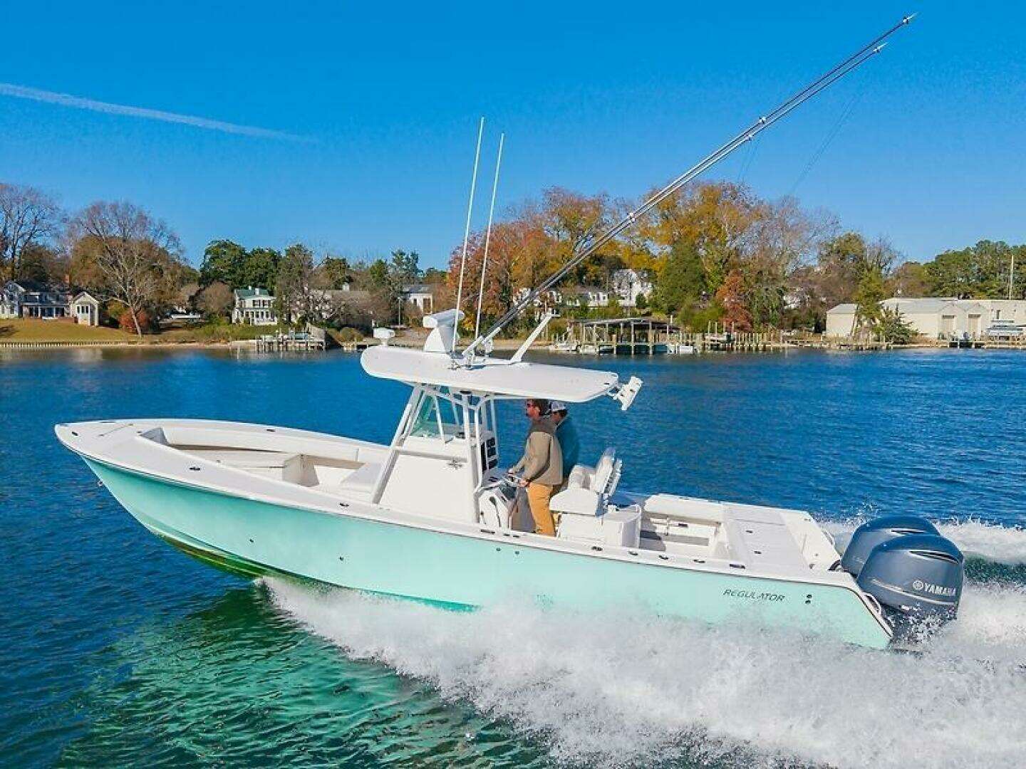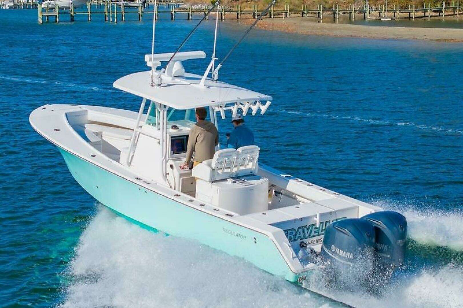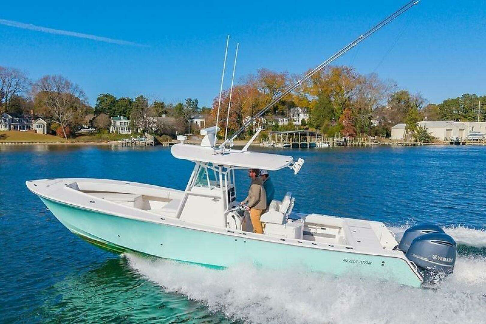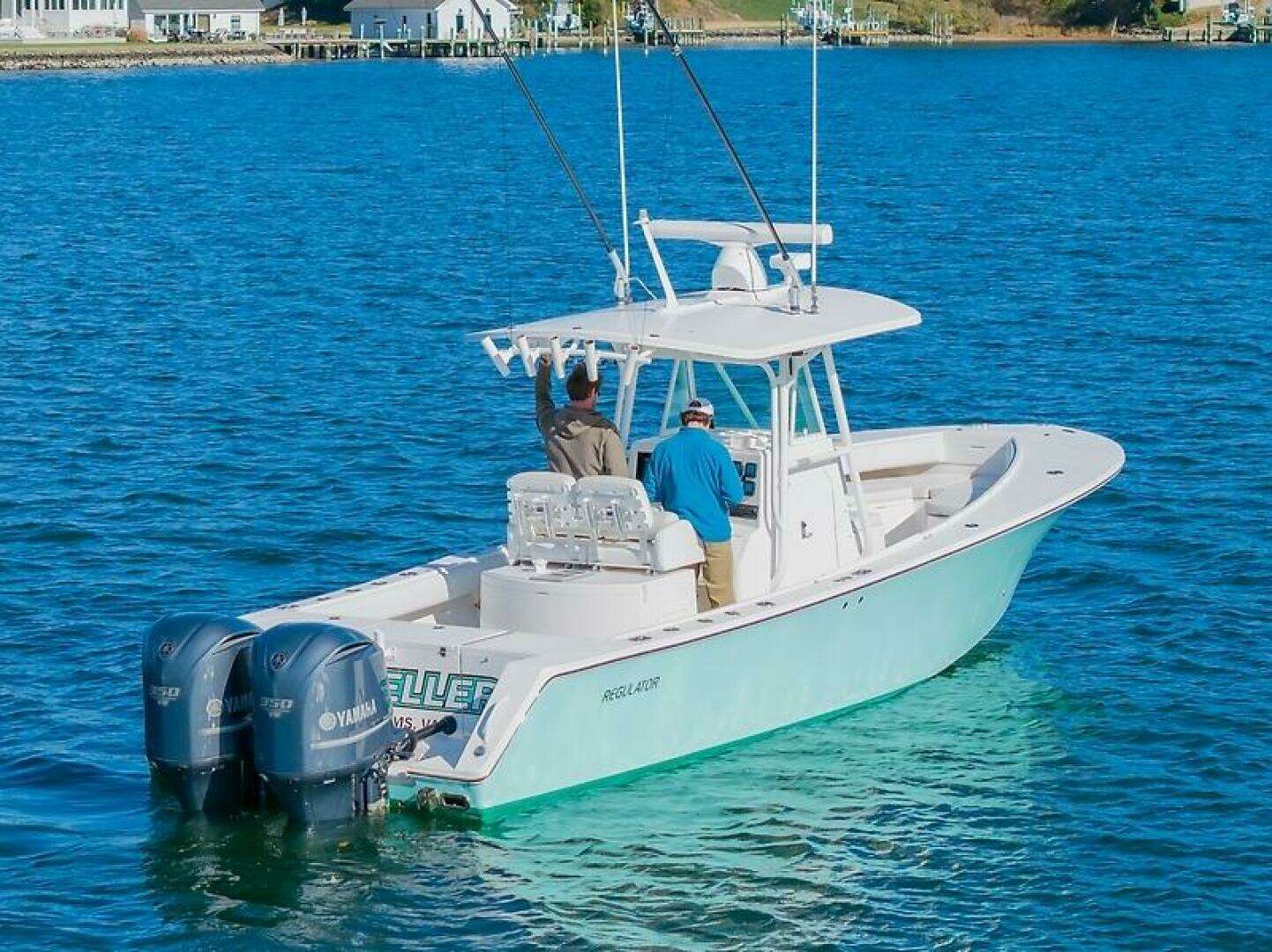 The Regulator 32FS is built for serious offshore anglers, delivering one of the smoothest and most solid rides in its class. Its strength comes from the Regulator’s exclusive Fiberglass Grillage System and a heavy-duty all-fiberglass hull with a sharp-entry Deep-V and Carolina flare for a dry, comfortable ride. Designed for both performance and functionality, the 32FS features generous forward seating, 360° coaming pads, abundant storage including large fish boxes and locking rod compartments, a 40-gallon livewell, and a spacious 6'2" stand-up head with shower and sink. The rigging station provides tackle storage, a freshwater sink, rocket launchers, and more. Powered by twin Yamaha F350s with Command Link digital controls, the 32FS offers responsive handling and impressive offshore capability. Popular options include the solid fiberglass T-top and Lee Sidewinder outriggers.