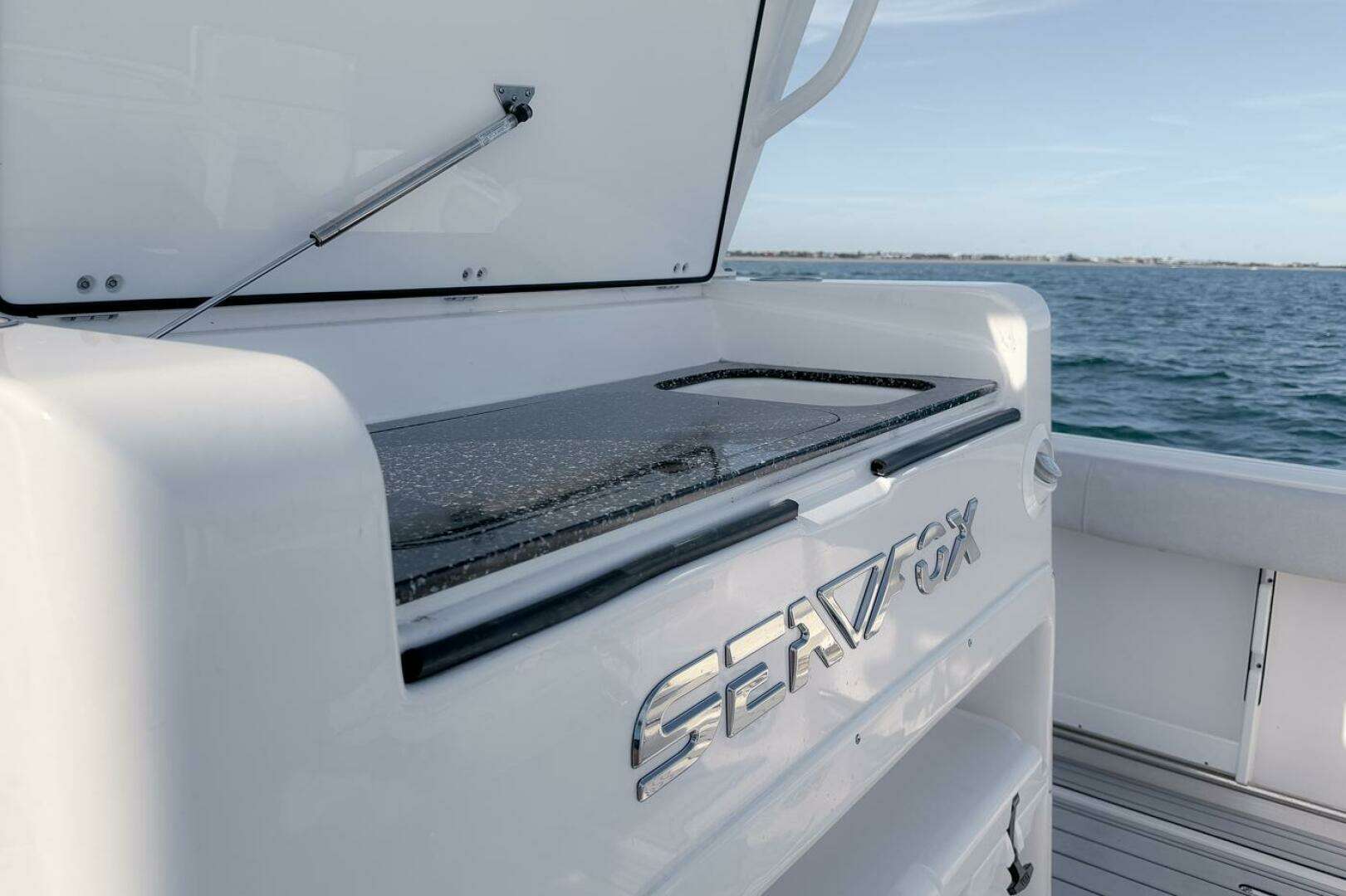 Fishing amenities abound, including 32 rod holders, an aquarium-style pressurized livewell with viewing window (30 gallons), plus a center pressurized livewell (60 gallons). The leaning post is fully outfitted with dual sinks and cutting station, Yeti cooler with slide, and integrated tackle storage—perfect for long days offshore.