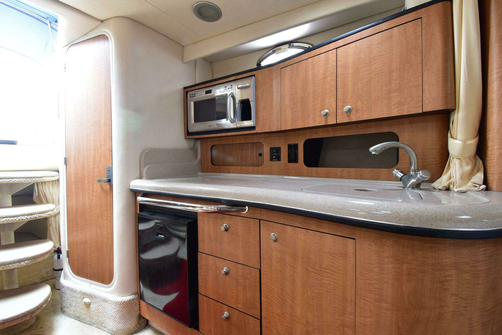 The cockpit is designed for entertaining, with wraparound seating, a wet bar, and plenty of room to relax. Step below deck and you’ll find a surprisingly roomy cabin with a full galley, convertible dinette, private forward berth, and a mid‑cabin lounge—perfect for overnight trips or extended weekend.